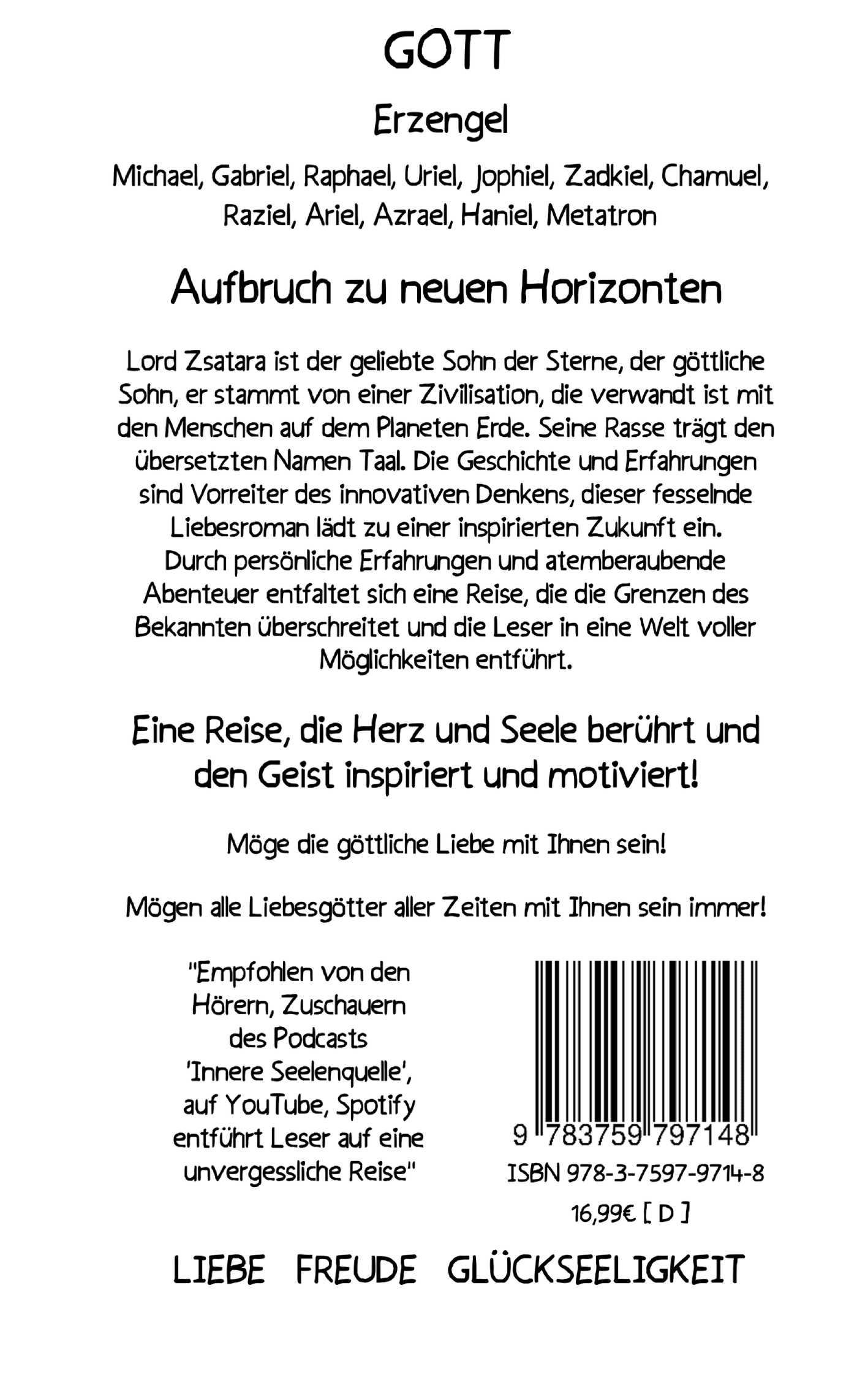 Lord Zsatara ist der geliebte Sohn der Sterne, der göttliche Sohn, er stammt von einer Zivilisation, die verwandt ist mit den Menschen auf dem Planeten Erde. Seine Rasse trägt den übersetzten Namen Taal. Die Geschichte und Erfahrungen sind Vorreiter des innovativen Denkens, dieser fesselnde Liebesroman lädt zu einer inspirierten Zukunft ein.