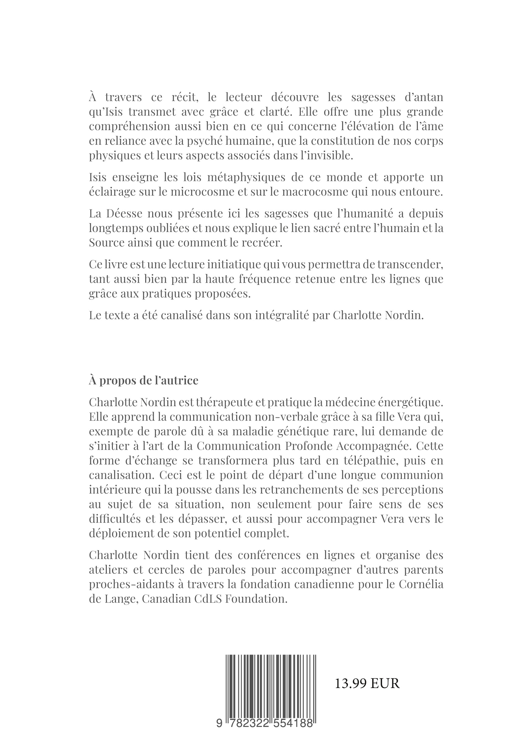 Charlotte Nordin est thérapeute et pratique la médecine énergétique. Elle apprend l'art de la canalisation grâce à sa fille Vera qui, non-verbale dû à sa maladie génétique rare, lui demande de s'initier à la pratique de la Communication profonde Accompagnée. Cette forme de communication se transformera plus tard en télépathie, puis en canalisation. Ceci est le point de départ d'une longue communion textuelle avec le divin qui s'ouvre à elle et à travers elle. Elle choisit de mettre sa plume au service de ce qui lui est demandé, lors d'une rencontre avec la Déesse Isis qui lui ouvre un territoire nouveau, qu'elle peut à présent transmettre à l'humanité. Charlotte Nordin a fondé L'Ecole de Mystère d'Isis, tient des conférences en ligne et des stages autour des enseignements qui lui ont été donné.