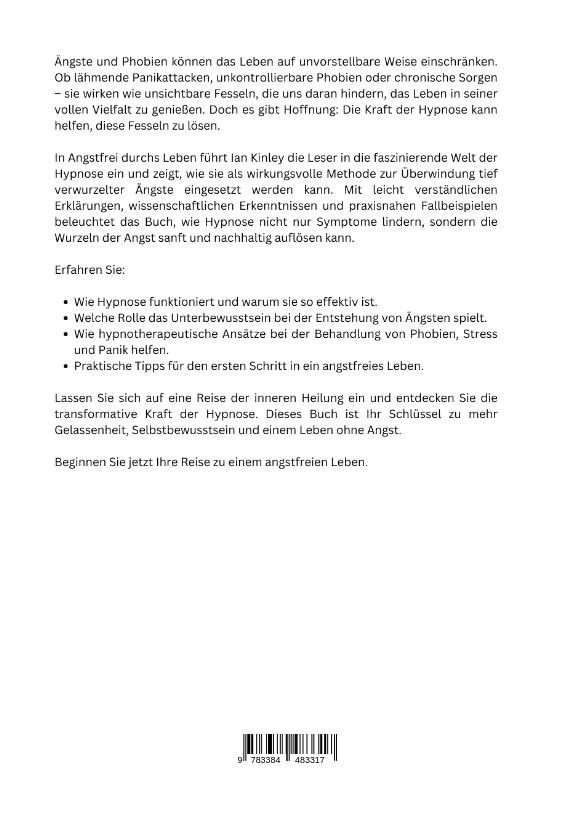 Ängste und Phobien können das Leben auf unvorstellbare Weise einschränken. Ob lähmende Panikattacken, unkontrollierbare Phobien oder chronische Sorgen - sie wirken wie unsichtbare Fesseln, die uns daran hindern, das Leben in seiner vollen Vielfalt zu genießen. Doch es gibt Hoffnung: Die Kraft der Hypnose kann helfen, diese Fesseln zu lösen.In Angstfrei durchs Leben führt Ian Kinley die Leser in die faszinierende Welt der Hypnose ein und zeigt, wie sie als wirkungsvolle Methode zur Überwindung tief verwurzelter Ängste eingesetzt werden kann. Mit leicht verständlichen Erklärungen, wissenschaftlichen Erkenntnissen und praxisnahen Fallbeispielen beleuchtet das Buch, wie Hypnose nicht nur Symptome lindern, sondern die Wurzeln der Angst sanft und nachhaltig auflösen kann.Erfahren Sie:Wie Hypnose funktioniert und warum sie so effektiv ist.Welche Rolle das Unterbewusstsein bei der Entstehung von Ängsten spielt.Wie hypnotherapeutische Ansätze bei der Behandlung von Phobien, Stress und Panik helfen.Praktische Tipps für den ersten Schritt in ein angstfreies LebenLassen Sie sich auf eine Reise der inneren Heilung ein und entdecken Sie die transformative Kraft der Hypnose. Dieses Buch ist Ihr Schlüssel zu mehr Gelassenheit, Selbstbewusstsein und einem Leben ohne Angst.Beginnen Sie jetzt Ihre Reise zu einem angstfreien Leben.