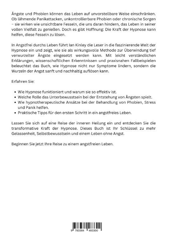 Ängste und Phobien können das Leben auf unvorstellbare Weise einschränken. Ob lähmende Panikattacken, unkontrollierbare Phobien oder chronische Sorgen - sie wirken wie unsichtbare Fesseln, die uns daran hindern, das Leben in seiner vollen Vielfalt zu genießen. Doch es gibt Hoffnung: Die Kraft der Hypnose kann helfen, diese Fesseln zu lösen.In Angstfrei durchs Leben führt Ian Kinley die Leser in die faszinierende Welt der Hypnose ein und zeigt, wie sie als wirkungsvolle Methode zur Überwindung tief verwurzelter Ängste eingesetzt werden kann. Mit leicht verständlichen Erklärungen, wissenschaftlichen Erkenntnissen und praxisnahen Fallbeispielen beleuchtet das Buch, wie Hypnose nicht nur Symptome lindern, sondern die Wurzeln der Angst sanft und nachhaltig auflösen kann.Erfahren Sie:Wie Hypnose funktioniert und warum sie so effektiv ist.Welche Rolle das Unterbewusstsein bei der Entstehung von Ängsten spielt.Wie hypnotherapeutische Ansätze bei der Behandlung von Phobien, Stress und Panik helfen.Praktische Tipps für den ersten Schritt in ein angstfreies LebenLassen Sie sich auf eine Reise der inneren Heilung ein und entdecken Sie die transformative Kraft der Hypnose. Dieses Buch ist Ihr Schlüssel zu mehr Gelassenheit, Selbstbewusstsein und einem Leben ohne Angst.Beginnen Sie jetzt Ihre Reise zu einem angstfreien Leben.