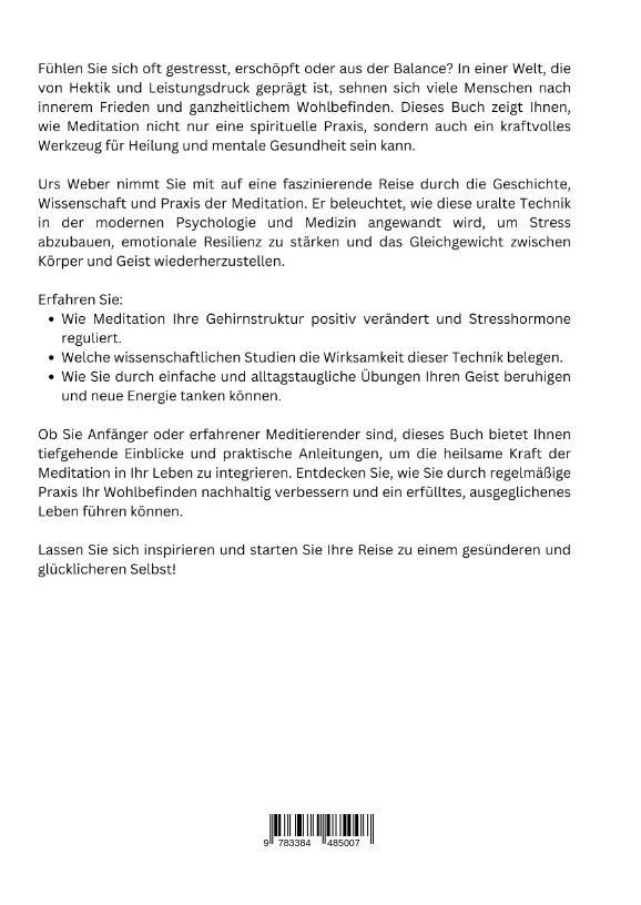 Fühlen Sie sich oft gestresst, erschöpft oder aus der Balance? In einer Welt, die von Hektik und Leistungsdruck geprägt ist, sehnen sich viele Menschen nach innerem Frieden und ganzheitlichem Wohlbefinden. Dieses Buch zeigt Ihnen, wie Meditation nicht nur eine spirituelle Praxis, sondern auch ein kraftvolles Werkzeug für Heilung und mentale Gesundheit sein kann.Urs Weber nimmt Sie mit auf eine faszinierende Reise durch die Geschichte, Wissenschaft und Praxis der Meditation. Er beleuchtet, wie diese uralte Technik in der modernen Psychologie und Medizin angewandt wird, um Stress abzubauen, emotionale Resilienz zu stärken und das Gleichgewicht zwischen Körper und Geist wiederherzustellen.Erfahren Sie:Wie Meditation Ihre Gehirnstruktur positiv verändert und Stresshormone reguliert.Welche wissenschaftlichen Studien die Wirksamkeit dieser Technik belegen.Wie Sie durch einfache und alltagstaugliche Übungen Ihren Geist beruhigen und neue Energie tanken können.Ob Sie Anfänger oder erfahrener Meditierender sind, dieses Buch bietet Ihnen tiefgehende Einblicke und praktische Anleitungen, um die heilsame Kraft der Meditation in Ihr Leben zu integrieren. Entdecken Sie, wie Sie durch regelmäßige Praxis Ihr Wohlbefinden nachhaltig verbessern und ein erfülltes, ausgeglichenes Leben führen können.Lassen Sie sich inspirieren und starten Sie Ihre Reise zu einem gesünderen und glücklicheren Selbst!