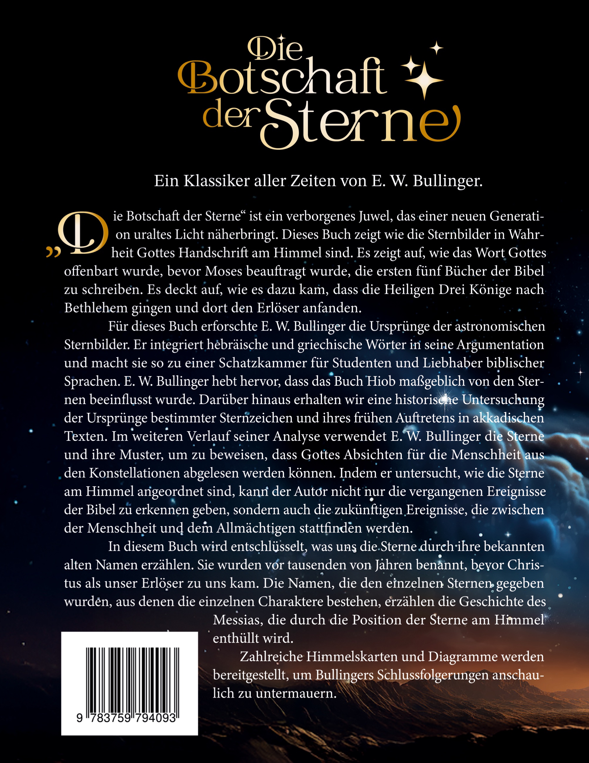 Ein Klassiker aller Zeiten von E. W. Bullinger. Die Botschaft der Sterne ist ein verborgenes Juwel, das einer neuen Generation uraltes Licht näherbringt. Es zeigt wie die Sternbilder in Wahrheit Gottes Handschrift am Himmel sind. Dieses Buch erklärt, wie das Wort Gottes offenbart wurde, bevor Moses beauftragt wurde, die ersten fünf Bücher der Bibel zu schreiben. Es deckt auf, wie es dazu kam, dass die Heiligen Drei Könige nach Bethlehem gingen und dort den Erlöser anfanden. Für dieses Buch erforschte E. W. Bullinger die Ursprünge der astronomischen Sternbilder. Er integriert hebräische und griechische Wörter in seine Argumentation und macht sie so zu einer Schatzkammer für Studenten und Liebhaber biblischer Sprachen. E. W. Bullinger hebt hervor, dass das Buch Hiob maßgeblich von den Sternen beeinflusst wurde. Darüber hinaus erhalten wir eine historische Untersuchung der Ursprünge bestimmter Sternzeichen und ihres frühen Auftretens in akkadischen Texten. Im weiteren Verlauf seiner Analyse verwendet E. W. Bullinger die Sterne und ihre Muster, um zu beweisen, dass Gottes Absichten für die Menschheit aus den Konstellationen abgelesen werden können. Indem er untersucht, wie die Sterne am Himmel angeordnet sind, kann der Autor nicht nur die vergangenen Ereignisse der Bibel abbilden, sondern auch die zukünftigen Ereignisse, die zwischen der Menschheit und dem Allmächtigen stattfinden werden. Dieses Buch entschlüsselt, was uns die Sterne durch ihre bekannten alten Namen erzählen. Sie wurden vor tausenden von Jahren benannt, bevor Christus als unser Erlöser zu uns kam. Die Namen, die den einzelnen Sternen gegeben wurden, aus denen die einzelnen Charaktere bestehen, erzählen die Geschichte des Messias, die durch seine Platzierung der Sterne im Himmel enthüllt wird. Zahlreiche Himmelskarten und Diagramme werden bereitgestellt, um Bullingers Schlussfolgerungen anschaulich zu untermauern.