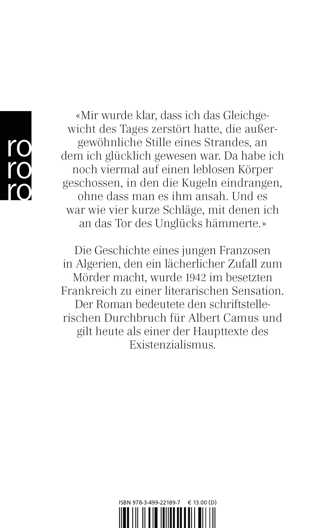 Die Geschichte eines jungen Franzosen in Algerien, den ein lächerlicher Zufall zum Mörder macht, wurde 1942 im besetzten Frankreich zu einer literarischen Sensation. Der Roman bedeutete den schriftstellerischen Durchbruch für Albert Camus und gilt heute als einer der Haupttexte des Existenzialismus.