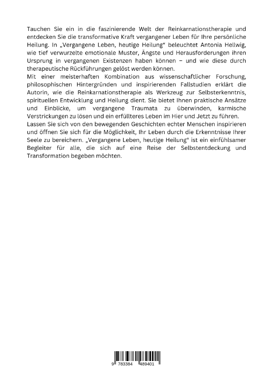 Tauchen Sie ein in die faszinierende Welt der Reinkarnationstherapie und entdecken Sie die transformative Kraft vergangener Leben für Ihre persönliche Heilung. In "Vergangene Leben, heutige Heilung" beleuchtet Antonia Hellwig, wie tief verwurzelte emotionale Muster, Ängste und Herausforderungen ihren Ursprung in vergangenen Existenzen haben können - und wie diese durch therapeutische Rückführungen gelöst werden können.Mit einer meisterhaften Kombination aus wissenschaftlicher Forschung, philosophischen Hintergründen und inspirierenden Fallstudien erklärt die Autorin, wie die Reinkarnationstherapie als Werkzeug zur Selbsterkenntnis, spirituellen Entwicklung und Heilung dient. Sie bietet Ihnen praktische Ansätze und Einblicke, um vergangene Traumata zu überwinden, karmische Verstrickungen zu lösen und ein erfüllteres Leben im Hier und Jetzt zu führen.Lassen Sie sich von den bewegenden Geschichten echter Menschen inspirieren und öffnen Sie sich für die Möglichkeit, Ihr Leben durch die Erkenntnisse Ihrer Seele zu bereichern. "Vergangene Leben, heutige Heilung" ist ein einfühlsamer Begleiter für alle, die sich auf eine Reise der Selbstentdeckung und Transformation begeben möchten.