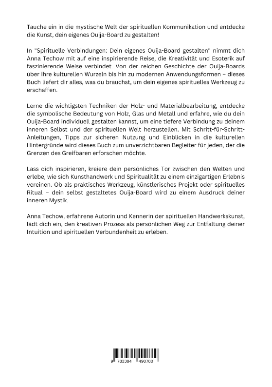 In "Spirituelle Verbindungen: Dein eigenes Ouija-Board gestalten" nimmt dich Anna Techow mit auf eine inspirierende Reise, die Kreativität und Esoterik auf faszinierende Weise verbindet. Von der reichen Geschichte der Ouija-Boards über ihre kulturellen Wurzeln bis hin zu modernen Anwendungsformen - dieses Buch liefert dir alles, was du brauchst, um dein eigenes spirituelles Werkzeug zu erschaffen.Lerne die wichtigsten Techniken der Holz- und Materialbearbeitung, entdecke die symbolische Bedeutung von Holz, Glas und Metall und erfahre, wie du dein Ouija-Board individuell gestalten kannst, um eine tiefere Verbindung zu deinem inneren Selbst und der spirituellen Welt herzustellen. Mit Schritt-für-Schritt-Anleitungen, Tipps zur sicheren Nutzung und Einblicken in die kulturellen Hintergründe wird dieses Buch zum unverzichtbaren Begleiter für jeden, der die Grenzen des Greifbaren erforschen möchte.Lass dich inspirieren, kreiere dein persönliches Tor zwischen den Welten und erlebe, wie sich Kunsthandwerk und Spiritualität zu einem einzigartigen Erlebnis vereinen. Ob als praktisches Werkzeug, künstlerisches Projekt oder spirituelles Ritual - dein selbst gestaltetes Ouija-Board wird zu einem Ausdruck deiner inneren Mystik.Anna Techow, erfahrene Autorin und Kennerin der spirituellen Handwerkskunst, lädt dich ein, den kreativen Prozess als persönlichen Weg zur Entfaltung deiner Intuition und spirituellen Verbundenheit zu erleben.