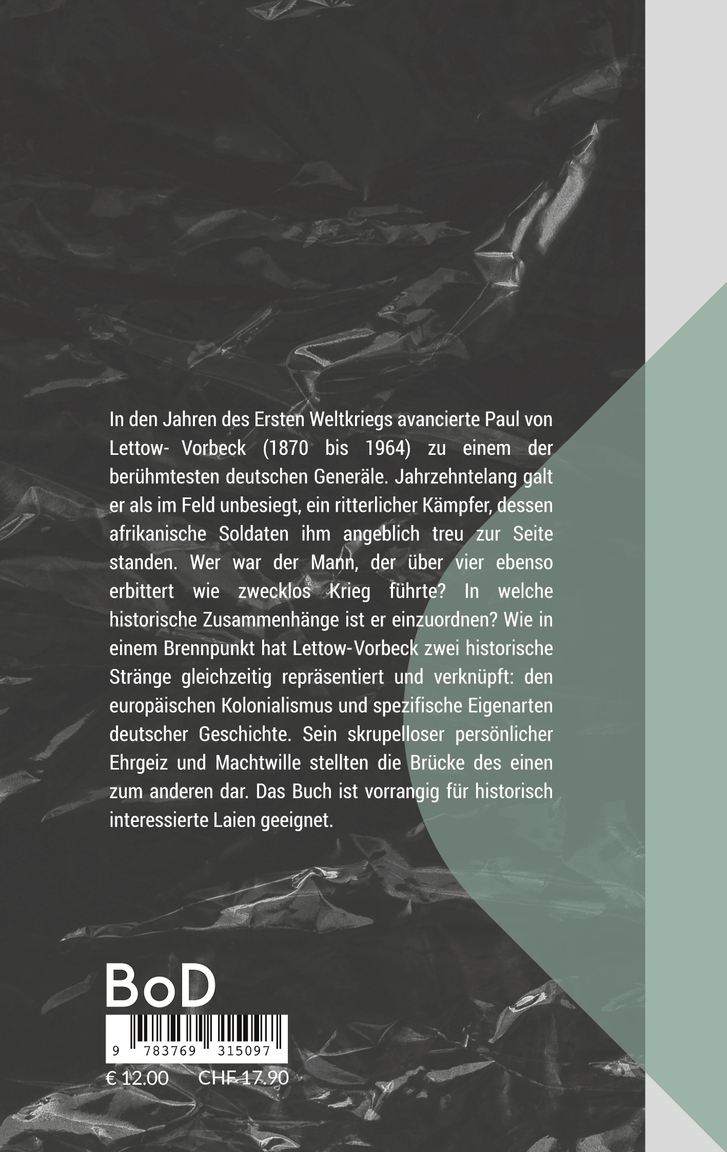 In den Jahren des Ersten Weltkriegs avancierte Paul von Lettow-Vorbeck (1870 bis 1964) zu einem der berühmtesten deutschen Generäle. Jahrzehntelang galt er als im Feld unbesiegt, ein ritterlicher Kämpfer, dessen afrikanische Soldaten ihm angeblich treu zur Seite standen. Wer war der Mann, der über vier ebenso erbittert wie zwecklos Krieg führte? In welche historische Zusammenhänge ist er einzuordnen? Wie in einem Brennpunkt hat Lettow-Vorbeck zwei historische Stränge gleichzeitig repräsentiert und verknüpft: den europäischen Kolonialismus und spezifische Eigenarten deutscher Geschichte. Sein skrupelloser persönlicher Ehrgeiz und Machtwille stellten die Brücke des einen zum anderen dar. Das Buch ist vorrangig für historisch interessierte Laien geeignet.