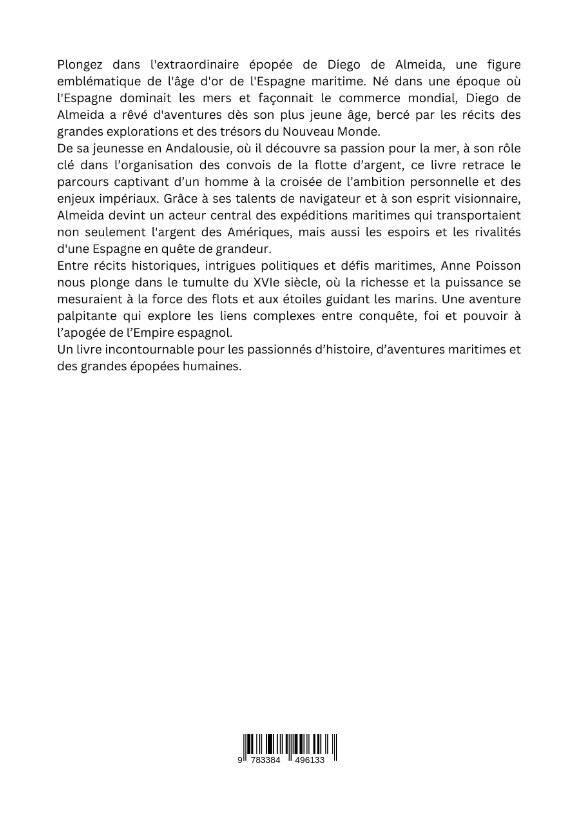Plongez dans l'extraordinaire épopée de Diego de Almeida, une figure emblématique de l'âge d'or de l'Espagne maritime. Né dans une époque où l'Espagne dominait les mers et façonnait le commerce mondial, Diego de Almeida a rêvé d'aventures dès son plus jeune âge, bercé par les récits des grandes explorations et des trésors du Nouveau Monde.De sa jeunesse en Andalousie, où il découvre sa passion pour la mer, à son rôle clé dans l'organisation des convois de la flotte d'argent, ce livre retrace le parcours captivant d'un homme à la croisée de l'ambition personnelle et des enjeux impériaux. Grâce à ses talents de navigateur et à son esprit visionnaire, Almeida devint un acteur central des expéditions maritimes qui transportaient non seulement l'argent des Amériques, mais aussi les espoirs et les rivalités d'une Espagne en quête de grandeur.Entre récits historiques, intrigues politiques et défis maritimes, Anne Poisson nous plonge dans le tumulte du XVIe siècle, où la richesse et la puissance se mesuraient à la force des flots et aux étoiles guidant les marins. Une aventure palpitante qui explore les liens complexes entre conquête, foi et pouvoir à l'apogée de l'Empire espagnol.Un livre incontournable pour les passionnés d'histoire, d'aventures maritimes et des grandes épopées humaines.