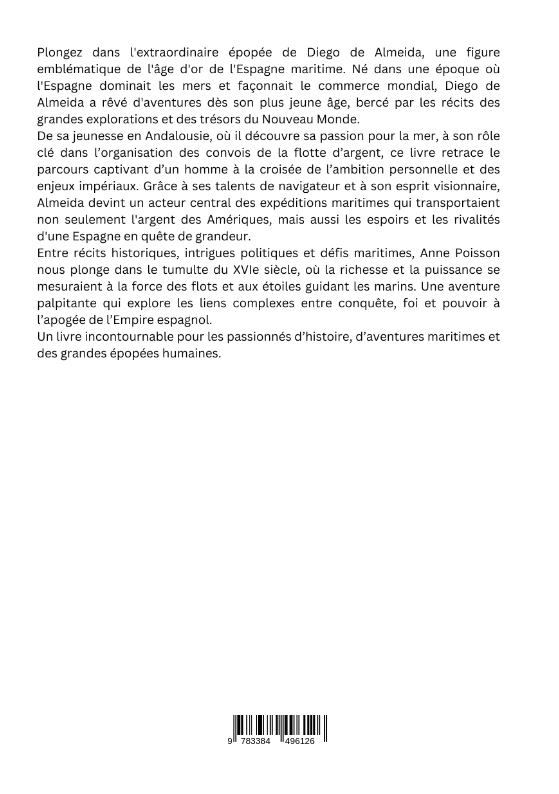 Plongez dans l'extraordinaire épopée de Diego de Almeida, une figure emblématique de l'âge d'or de l'Espagne maritime. Né dans une époque où l'Espagne dominait les mers et façonnait le commerce mondial, Diego de Almeida a rêvé d'aventures dès son plus jeune âge, bercé par les récits des grandes explorations et des trésors du Nouveau Monde.De sa jeunesse en Andalousie, où il découvre sa passion pour la mer, à son rôle clé dans l'organisation des convois de la flotte d'argent, ce livre retrace le parcours captivant d'un homme à la croisée de l'ambition personnelle et des enjeux impériaux. Grâce à ses talents de navigateur et à son esprit visionnaire, Almeida devint un acteur central des expéditions maritimes qui transportaient non seulement l'argent des Amériques, mais aussi les espoirs et les rivalités d'une Espagne en quête de grandeur.Entre récits historiques, intrigues politiques et défis maritimes, Anne Poisson nous plonge dans le tumulte du XVIe siècle, où la richesse et la puissance se mesuraient à la force des flots et aux étoiles guidant les marins. Une aventure palpitante qui explore les liens complexes entre conquête, foi et pouvoir à l'apogée de l'Empire espagnol.Un livre incontournable pour les passionnés d'histoire, d'aventures maritimes et des grandes épopées humaines.