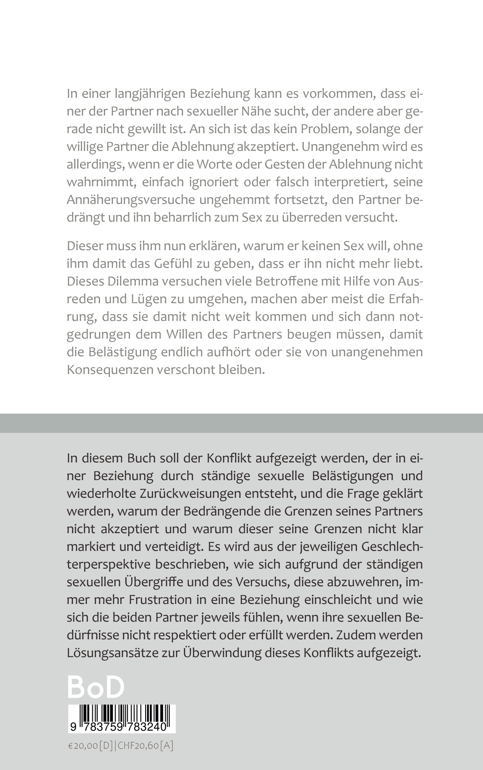 In diesem Buch soll der Konflikt aufgezeigt werden, der in einer Beziehung durch ständige sexuelle Belästigungen und wiederholte Zurückweisungen entsteht, und die Frage geklärt werden, warum der Bedrängende die Grenzen seines Partners nicht akzeptiert und warum dieser seine Grenzen nicht klar markiert und verteidigt. Es wird aus der jeweiligen Geschlechterperspektive beschrieben, wie sich aufgrund der ständigen sexuellen Übergriffe und des Versuchs, diese abzuwehren, immer mehr Frustration in eine Beziehung einschleicht und wie sich die beiden Partner jeweils fühlen, wenn ihre sexuellen Bedürfnisse nicht respektiert oder erfüllt werden. Zudem werden Lösungsansätze zur Überwindung dieses Konflikts aufgezeigt.