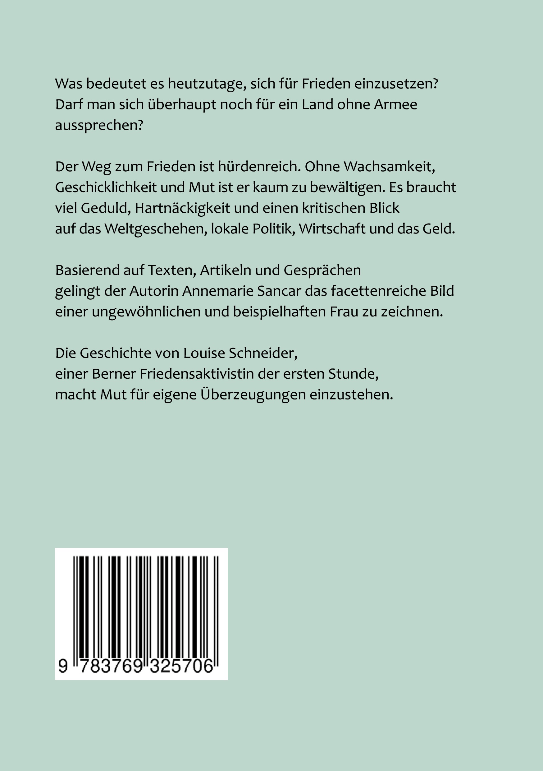 Was bedeutet es heutzutage, sich für Frieden einzusetzen? Darf man sich heute überhaupt für ein Land ohne Armee aussprechen? Der Weg zum Frieden ist hürdenreich, ohne Wachsamkeit, Geschicklichkeit und Mut ist er kaum zu bewältigen. Es braucht Geduld, Hartnäckigkeit, einen kritischen Blick auf das Weltgeschehen, die lokale Politik, auf Wirtschaft und das Geld. Basierenden auf Texten und Gesprächen gelingt der Autorin Annemarie Sancar das facettenreiche Bild einer ungewöhnlichen und beispielhaften Frau zu zeichnen. Die Geschichte von Louise Schneider, einer Berner Friedensaktivistin der ersten Stunde, macht Mut für eigene Überzeugungen einzustehen.