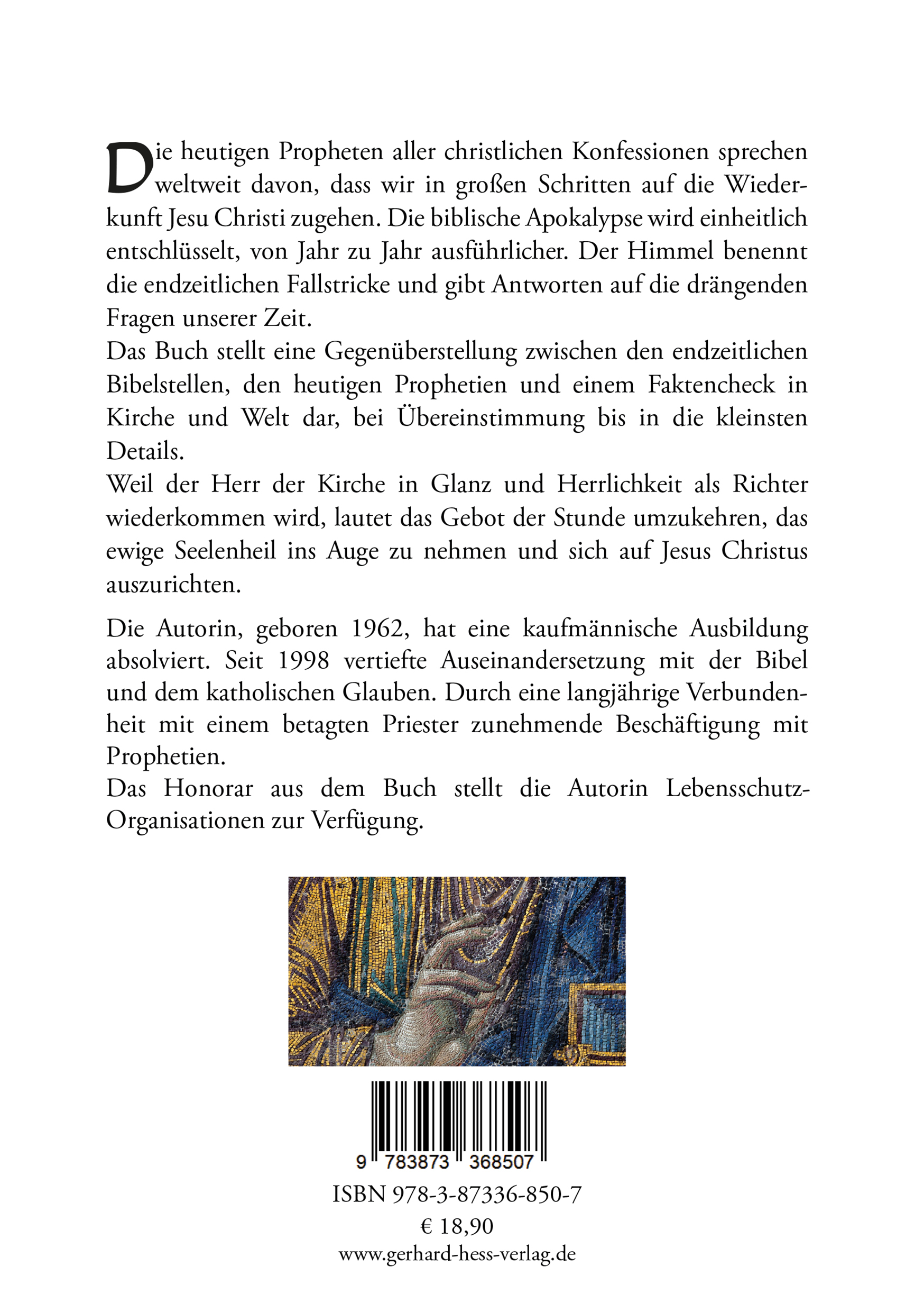 Die heutigen Propheten aller christlichen Konfessionen sprechen weltweit davon, dass wir in großen Schritten auf die Wiederkunft Jesu Christi zugehen. Die biblische Apokalypse wird einheitlich entschlüsselt, von Jahr zu Jahr ausführlicher. Der Himmel benennt die endzeitlichen Fallstricke und gibt Antworten auf die drängenden Fragen unserer Zeit. Das Buch stellt eine Gegenüberstellung zwischen den endzeitlichen Bibelstellen, den heutigen Prophetien und einem Faktencheck in Kirche und Welt dar, bei Übereinstimmung bis in die kleinsten Details. Weil der Herr der Kirche in Glanz und Herrlichkeit als Richter wiederkommen wird, lautet das Gebot der Stunde umzukehren, das ewige Seelenheil ins Auge zu nehmen und sich auf Jesus Christus auszurichten. Die Autorin, geboren 1962, hat eine kaufmännische Ausbildungabsolviert. Seit 1998 vertiefte Auseinandersetzung mit der Bibel und dem katholischen Glauben. Durch eine langjährige Verbundenheit mit einem betagten Priester zunehmende Beschäftigung mit Prophetien. Den Gewinn aus dem Buch stellt die Autorin Lebensschutz-Organisationen zur Verfügung.