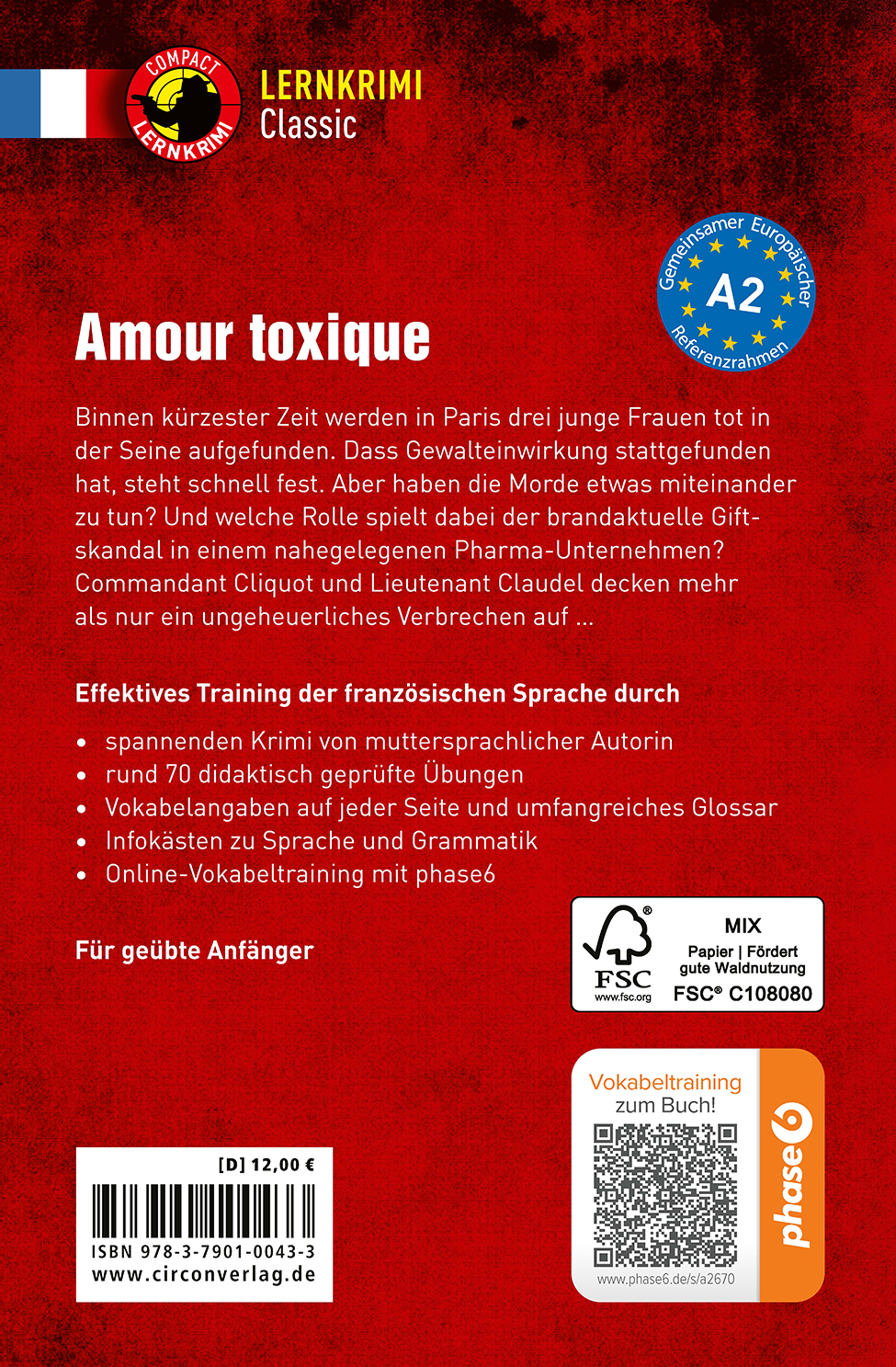 Sie lernen gerade Französisch und möchten Ihre Sprachkenntnisse verbessern oder vorhandenes Wissen auffrischen? Sie wollen lernen und dabei unterhalten werden? Sie lieben spannende Geschichten und wollen authentische Texte auf Französisch lesen? Dann sind unsere Lernkrimi Classics genau das Richtige für Sie. In "Amour toxique" erwartet Sie ein spannender Kriminalfall, der von einermuttersprachlichen Autorin speziell für das Niveau A2 geschrieben wurde. Mit dem einzigartigen Lernkonzept des Circon Verlags erwerben Sie spielerisch Sprachkompetenzen. Gehen Sie mit unseren Ermittler*innen auf Verbrecherjagd und verbessern Sie ganz nebenbei Ihren Französisch-Wortschatz, vertiefen Sie Ihre Grammatikkenntnisse und erfahren Sie Wissenswertes über Land und Leute. Speziell konzipierte, thematische Übungen werden in die spannenden Kriminalfälle eingebunden und erhöhen den Lerneffekt. So geht Sprachenlernen ganz nebenbei!