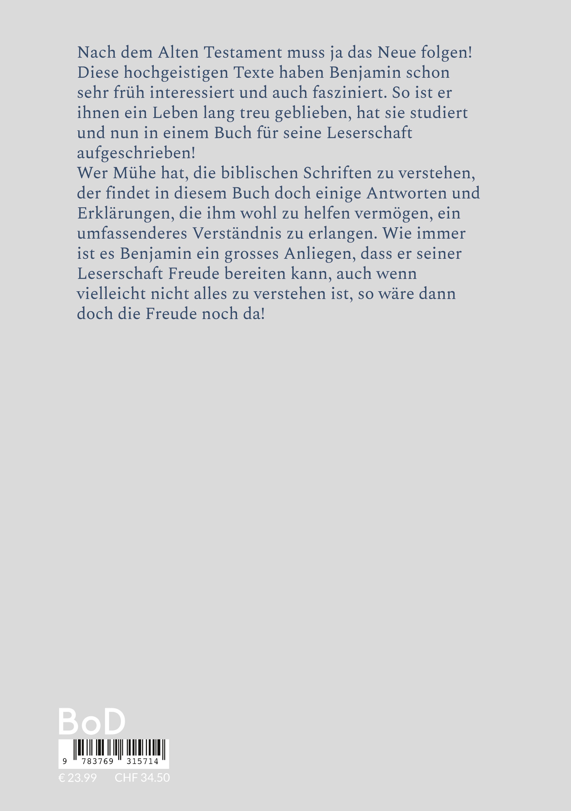 Wer Mühe hat, die biblischen Schriften zu verstehen, der findet in diesem Buch doch einige Antworten und Erklärungen, die ihm wohl zu helfen vermögen, ein umfassenderes Verständnis zu erlangen. Wie immer ist es Benjamin ein grosses Anliegen, dass er seiner Leserschaft Freude bereiten kann, auch wenn vielleicht nicht alles zu verstehen ist, so wäre dann doch die Freude noch da!