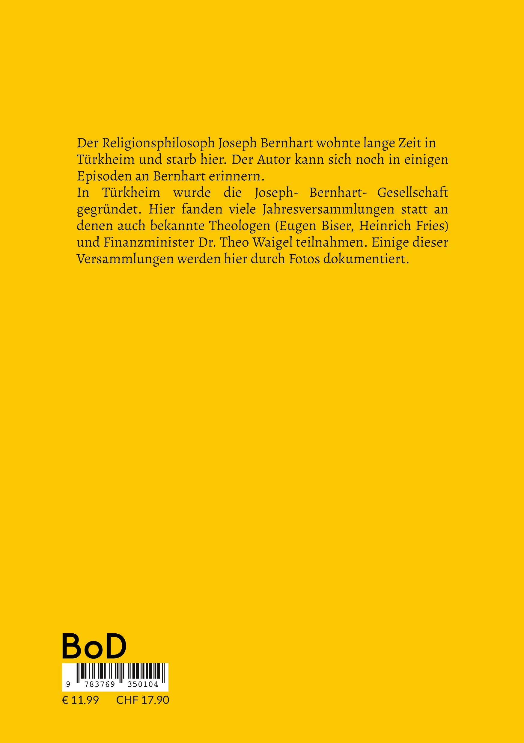 Der Religionsphilosoph Joseph Bernhart wohnte lange Zeit in Türkheim und starb hier. Der Autor kann sich noch in einigen Episoden an Bernhart erinnern.