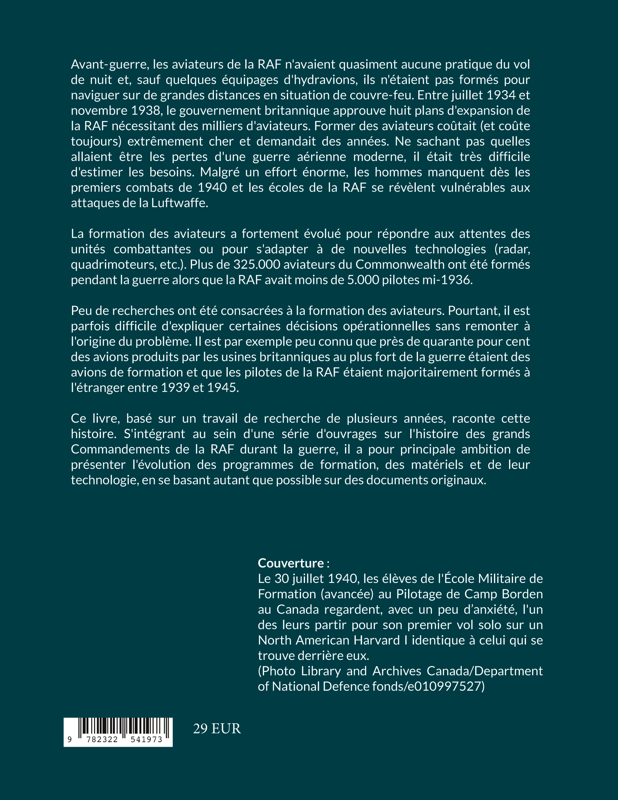 Peu de recherches ont été consacrées à la formation des aviateurs. Pourtant, il est parfois difficile d'expliquer certaines décisions opérationnelles sans remonter à l'origine du problème. Il est par exemple peu connu que près de quarante pour cent des avions produits par les usines britanniques au plus fort de la guerre étaient des avions de formation et que les pilotes de la RAF étaient majoritairement formés à l'étranger entre 1939 et 1945. Ce livre, basé sur un travail de recherche de plusieurs années, raconte cette histoire. S'intégrant au sein d'une série d'ouvrages sur l'histoire des grands Commandements de la RAF durant la guerre, il a pour principale ambition de présenter l'évolution programmes de formation, des matériels et de leur technologie en se basant autant que possible sur des documents originaux.