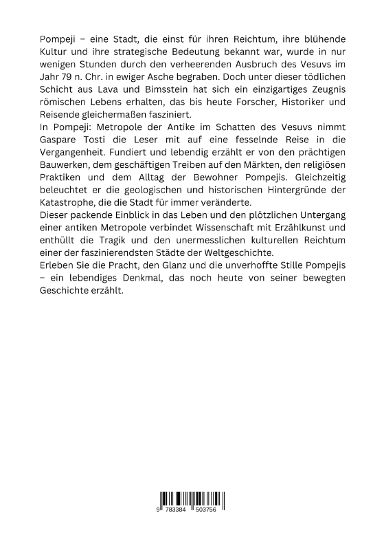 Pompeji - eine Stadt, die einst für ihren Reichtum, ihre blühende Kultur und ihre strategische Bedeutung bekannt war, wurde in nur wenigen Stunden durch den verheerenden Ausbruch des Vesuvs im Jahr 79 n. Chr. in ewiger Asche begraben. Doch unter dieser tödlichen Schicht aus Lava und Bimsstein hat sich ein einzigartiges Zeugnis römischen Lebens erhalten, das bis heute Forscher, Historiker und Reisende gleichermaßen fasziniert.In Pompeji: Metropole der Antike im Schatten des Vesuvs nimmt Gaspare Tosti die Leser mit auf eine fesselnde Reise in die Vergangenheit. Fundiert und lebendig erzählt er von den prächtigen Bauwerken, dem geschäftigen Treiben auf den Märkten, den religiösen Praktiken und dem Alltag der Bewohner Pompejis. Gleichzeitig beleuchtet er die geologischen und historischen Hintergründe der Katastrophe, die die Stadt für immer veränderte.Dieser packende Einblick in das Leben und den plötzlichen Untergang einer antiken Metropole verbindet Wissenschaft mit Erzählkunst und enthüllt die Tragik und den unermesslichen kulturellen Reichtum einer der faszinierendsten Städte der Weltgeschichte.Erleben Sie die Pracht, den Glanz und die unverhoffte Stille Pompejis - ein lebendiges Denkmal, das noch heute von seiner bewegten Geschichte erzählt.