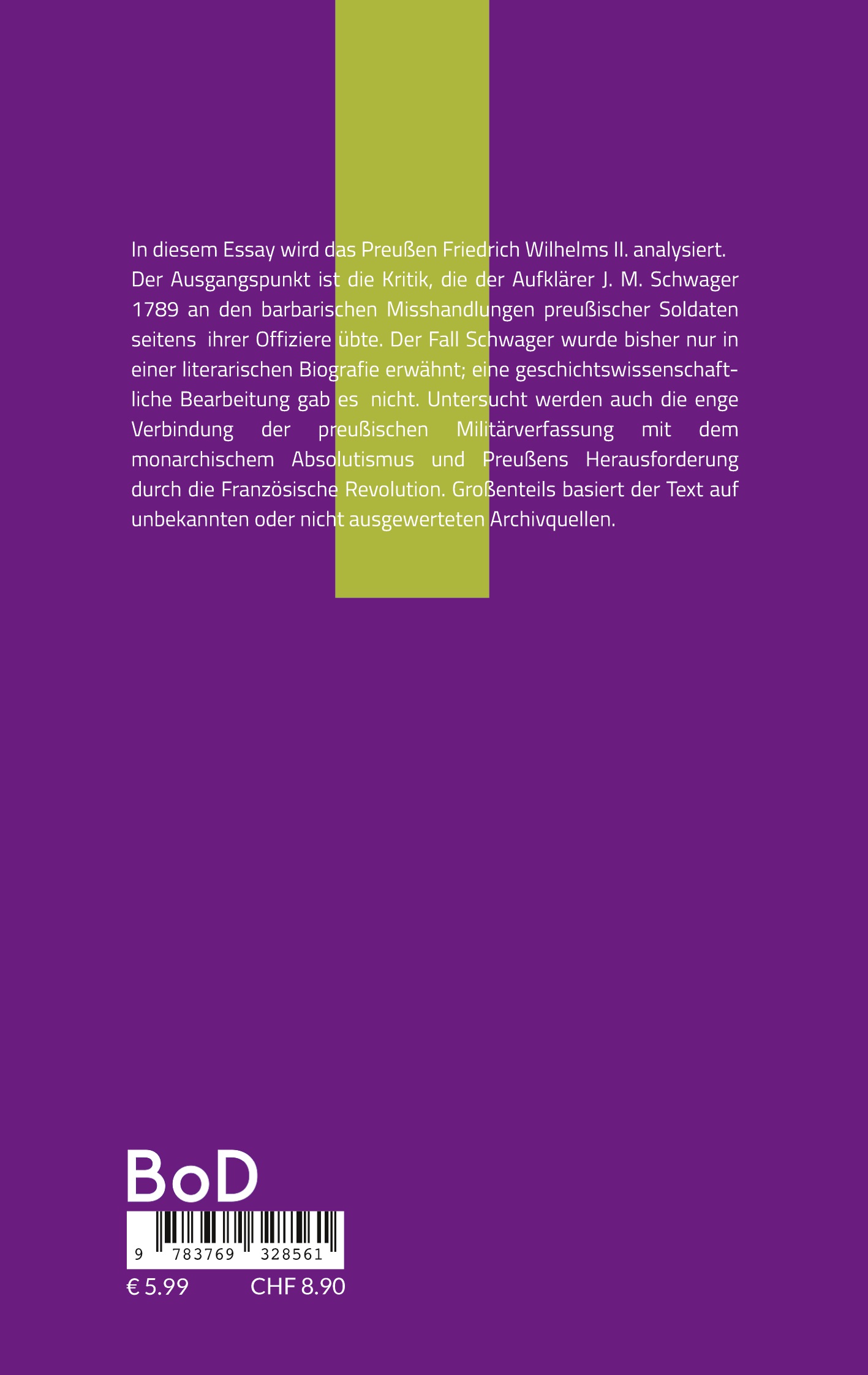 In diesem Essay wird das Preußen Friedrich Wilhelms II. analysiert. Der Ausgangspunkt ist die Kritik, die der Aufklärer J. M. Schwager 1789 an den barbarischen Misshandlungen preußischer Soldaten seitens ihrer Offiziere übte. Der Fall Schwager wurde bisher nur in einer literarischen Biografie erwähnt; eine geschichtswissenschaftliche Bearbeitung gab es nicht. Untersucht werden auch die enge Verbindung der preußischen Militärverfassung mit dem monarchischem Absolutismus und Preußens Herausforderung durch die Französische Revolution. Großenteils basiert der Text auf unbekannten oder nicht ausgewerteten Archivquellen.