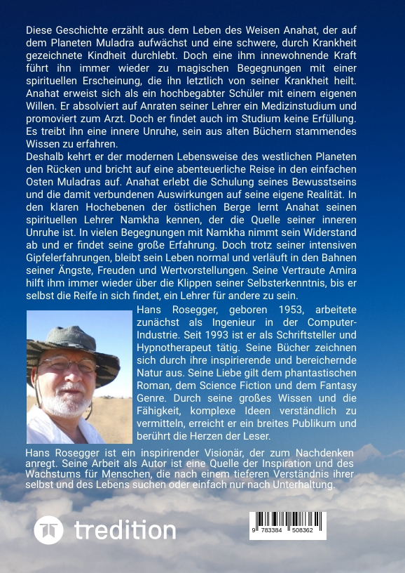 Hans Rosegger, geboren 1953, arbeitete zunächst als Ingenieur in der Elektronik- und Softwareindustrie. Seit 1993 ist er als Schriftsteller und Hypnotherapeut tätig. Seine Bücher zeichnen sich durch ihre inspirierende und bereichernde Natur aus. Sie decken eine Vielzahl von Themen ab, darunter Persönlichkeitsentwicklung, Spiritualität, Meditation und bewusstes Leben. Doch seine Liebe gilt dem phantastischen Roman, dem Science Fiction und dem Fantasy Genre. Durch seine tiefgreifenden Einsichten und seine Fähigkeit, komplexe Ideen auf verständliche Weise zu vermitteln, erreicht er ein breites Publikum und berührt die Herzen der Leser. Als engagierter Autor und Seminarleiter teilt er sein Wissen und seine Erfahrungen nicht nur in gedruckter Form. In seinen Seminaren tritt er in persönlichen Interaktionen mit seinen Lesern und Teilnehmern in Kontakt. Hans Rosegger ist ein Visionär, der Menschen dazu inspiriert, ihre innere Weisheit zu entdecken und ihr volles Potenzial zu entfalten. Seine Arbeit als Autor und Coach ist eine Quelle der Inspiration und des Wachstums für Menschen, die nach einem tieferen Verständnis ihrer selbst und des Lebens suchen. Auf seiner Internetseite www.plejaden.de finden Interessierte weitere Informationen über seine Bücher sowie die Möglichkeit, direkt mit ihm in Kontakt zu treten. Hier können Menschen einen tieferen Einblick in ihre eigene Entwicklung gewinnen.