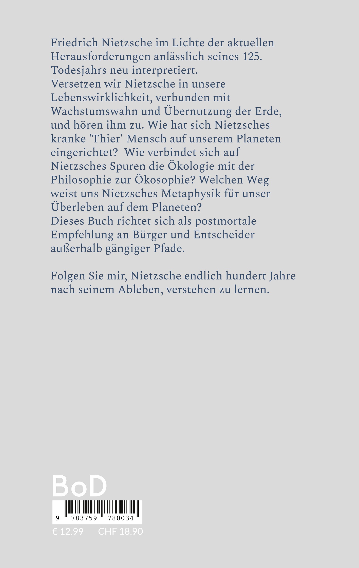 Versetzen wir Nietzsche in unsere Lebenswirklichkeit, verbunden mit Wachstumswahn und Übernutzung der Erde, und hören ihm zu. Wie hat sich Nietzsches kranke 'Thier' Mensch auf unserem Planeten eingerichtet? Wie verbindet sich auf Nietzsches Spuren die Ökologie mit der Philosophie zur Ökosophie? Welchen Weg weist uns Nietzsches Metaphysik für unser Überleben auf dem Planeten?