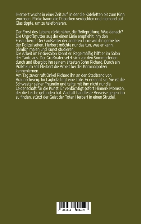 Herbert wuchs in einer Zeit auf, in der die Koteletten bis zum Kinn wuchsen, Röcke kaum die Pobacken verdeckten und niemand auf Glas tippte, um zu telefonieren.Der Ernst des Lebens rückt näher, die Reifeprüfung. Was danach? Die Urgroßmutter aus der einen Linie empfiehlt ihm den Friseurberuf. Der Großvater der anderen Linie will ihn gerne bei der Polizei sehen. Herbert möchte nur das tun, was er kann, nämlich malen und Kunst studieren.Die Arbeit im Frisiersalon kennt er. Regelmäßig hilft er im Salon der Tante aus. Der Großvater setzt sich vor den Sommerferien durch und übergibt ihn seinem ältesten Sohn Richard. Durch ein Praktikum soll Herbert die Arbeit bei der Kriminalpolizei kennenlernen.Am Tag zuvor ruft Onkel Richard ihn an den Stadtrand von Braunschweig. Im Lagholz liegt eine Tote. Er erkennt sie. Sie ist die Schwester seiner Freundin und teilte mit ihm nicht nur die Leidenschaft für die Kunst. Er verdächtigt sofort Hinnerk Momsen, der die Leiche gefunden hat. Anstatt handfeste Beweise gegen ihn zu finden, stürzt der Geist der Toten Herbert in einen Strudel.