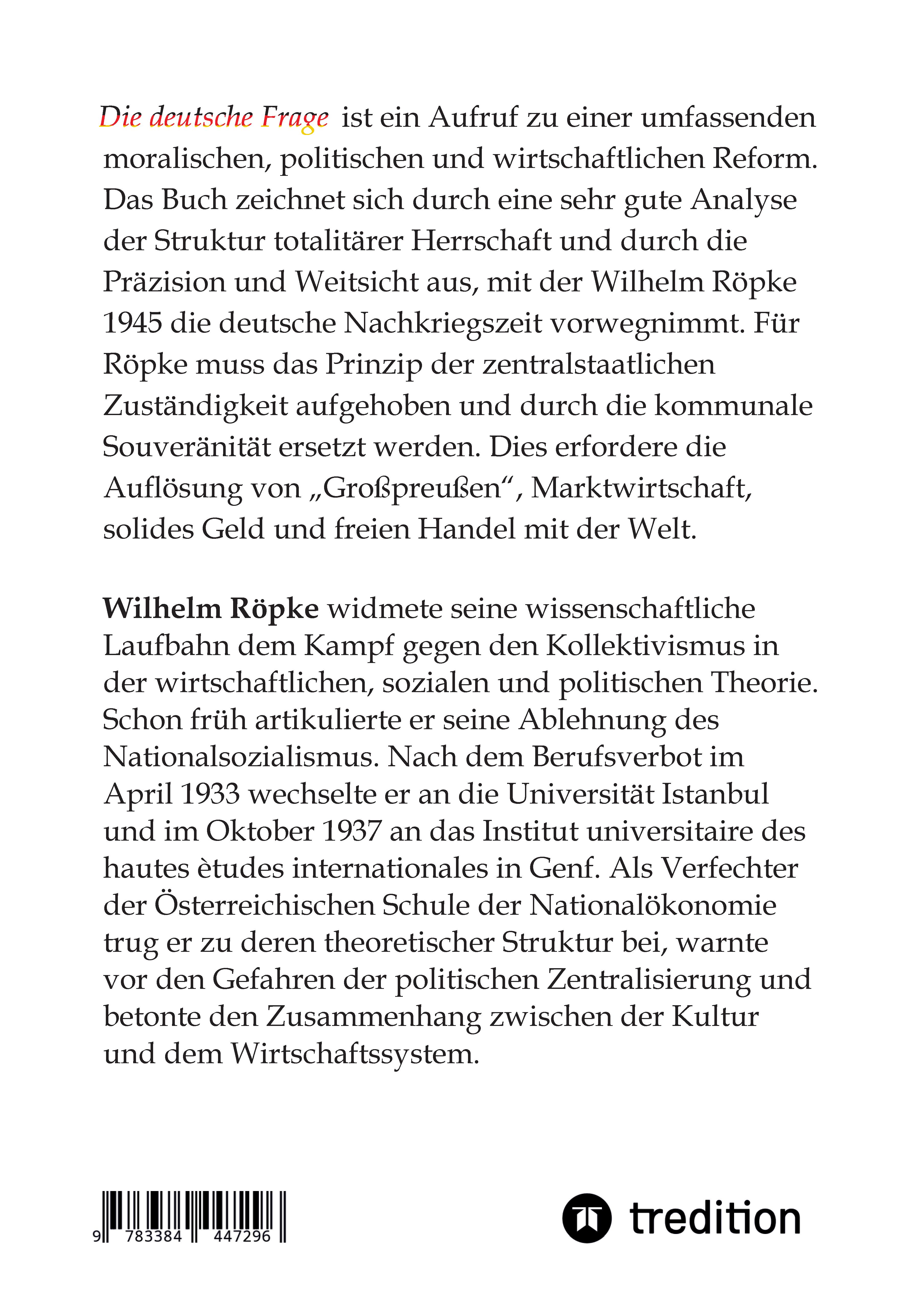 Die deutsche Frage von Wilhelm Röpke ist das Buch eines Zeitzeugen. Das Buch erschien in dritter Auflage 1948. Das Buch handelt in seinem ersten Teil vom Dritten Reich und seinem Ende, im zweiten Teil von den historischen Wurzeln des Nationalsozialismus und in seinem dritten Teil von der Lösung der deutschen Frage. Die deutsche Frage ist ein Aufruf zu einer umfassenden moralischen, politischen und wirtschaftlichen Reform. Das Buch zeichnet sich durch eine sehr gute Analyse der Struktur totalitärer Herrschaft aus. Für Wilhelm Röpke muß das Prinzip, daß der Zentralstaat für die gesamte Gesellschaft zuständig ist, beseitigt und durch die kommunale Souveränität ersetzt werden. Dies erfordere die Auflösung des Zentralstaates, die Abschaffung der Monopole in Industrie, Bildung und Gesundheitswesen, die Wiederherstellung eines gesunden Geldes und den freien Handel mit der Welt.