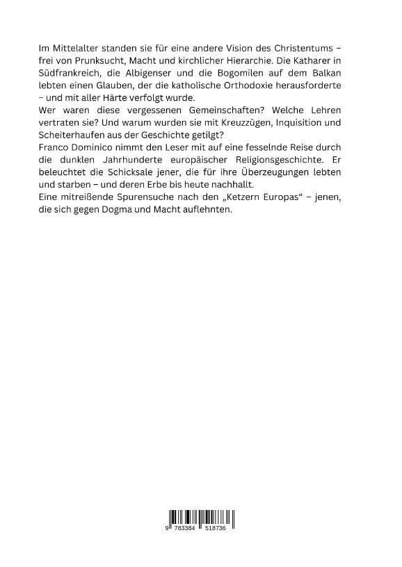 Im Mittelalter standen sie für eine andere Vision des Christentums - frei von Prunksucht, Macht und kirchlicher Hierarchie. Die Katharer in Südfrankreich, die Albigenser und die Bogomilen auf dem Balkan lebten einen Glauben, der die katholische Orthodoxie herausforderte - und mit aller Härte verfolgt wurde.Wer waren diese vergessenen Gemeinschaften? Welche Lehren vertraten sie? Und warum wurden sie mit Kreuzzügen, Inquisition und Scheiterhaufen aus der Geschichte getilgt?Franco Dominico nimmt den Leser mit auf eine fesselnde Reise durch die dunklen Jahr-hunderte europäischer Religionsgeschichte. Er beleuchtet die Schicksale jener, die für ihre Überzeugungen lebten und starben - und deren Erbe bis heute nachhallt.Eine mitreißende Spurensuche nach den "Ketzern Europas" - jenen, die sich gegen Dogma und Macht auflehnten.