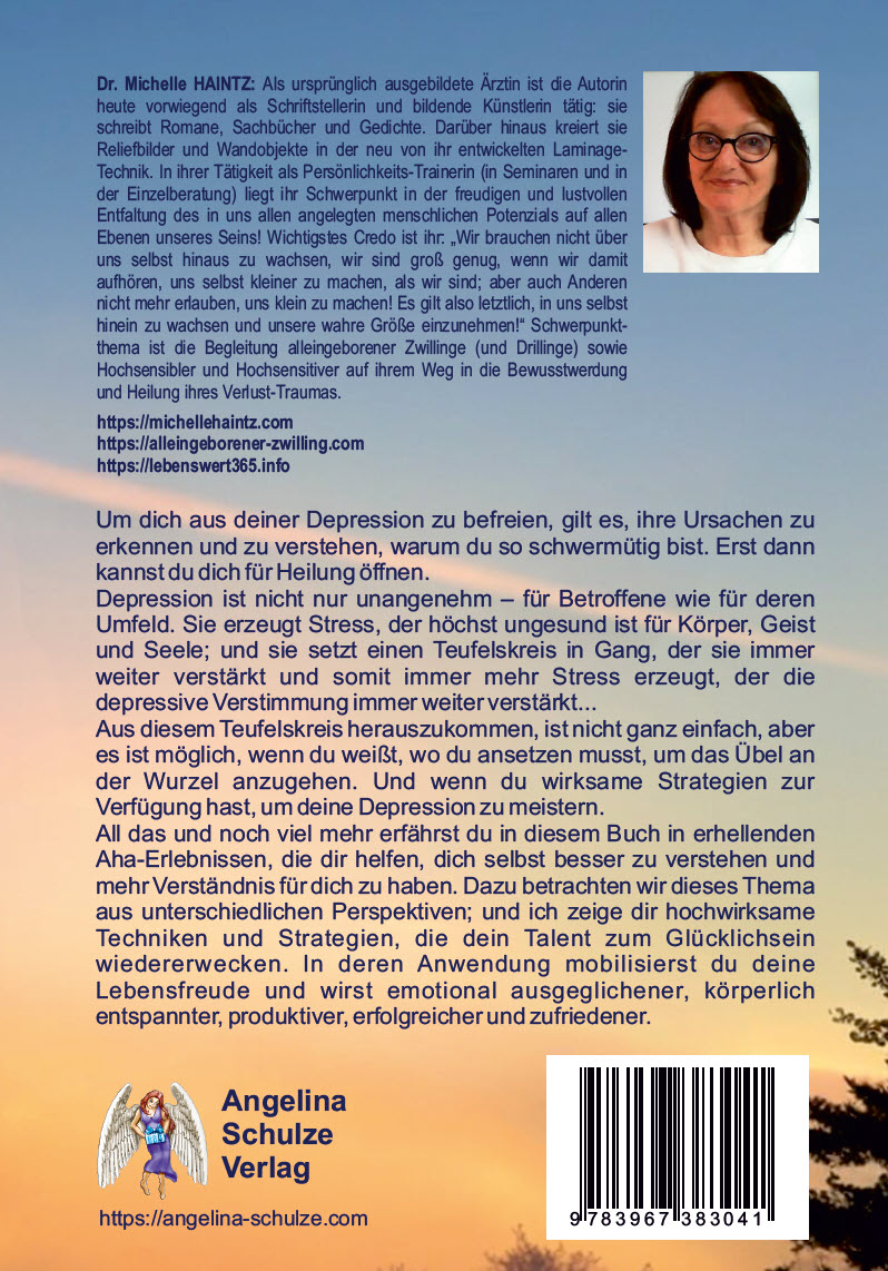 Autorin: Dr. Michelle HAINTZ Als ursprünglich ausgebildete Ärztin ist die Autorin heute vorwiegend als Schriftstellerin und bildende Künstlerin tätig: sie schreibt Romane, Sachbücher und Gedichte. Darüber hinaus kreiert sie Reliefbilder und Wandobjekte in der neu von ihr entwickelten Laminage-Technik. In ihrer Tätigkeit als Persönlichkeits-Trainerin (in Seminaren und in der Einzelberatung) liegt ihr Schwerpunkt in der freudigen und lustvollen Entfaltung des in uns allen angelegten menschlichen Potenzials auf allen Ebenen unseres Seins! Wichtigstes Credo ist ihr: „Wir brauchen nicht über uns selbst hinaus zu wachsen, wir sind groß genug, wenn wir damit aufhören, uns selbst kleiner zu machen, als wir sind; aber auch Anderen nicht mehr erlauben, uns klein zu machen! Es gilt also letztlich, in uns selbst hinein zu wachsen und unsere wahre Größe einzunehmen!“ Schwerpunktthema ist die Begleitung alleingeborener Zwillinge (und Drillinge) sowie Hochsensibler und Hochsensitiver auf ihrem Weg in die Bewusstwerdung und Heilung ihres Verlust-Traumas. www.michellehaintz.at