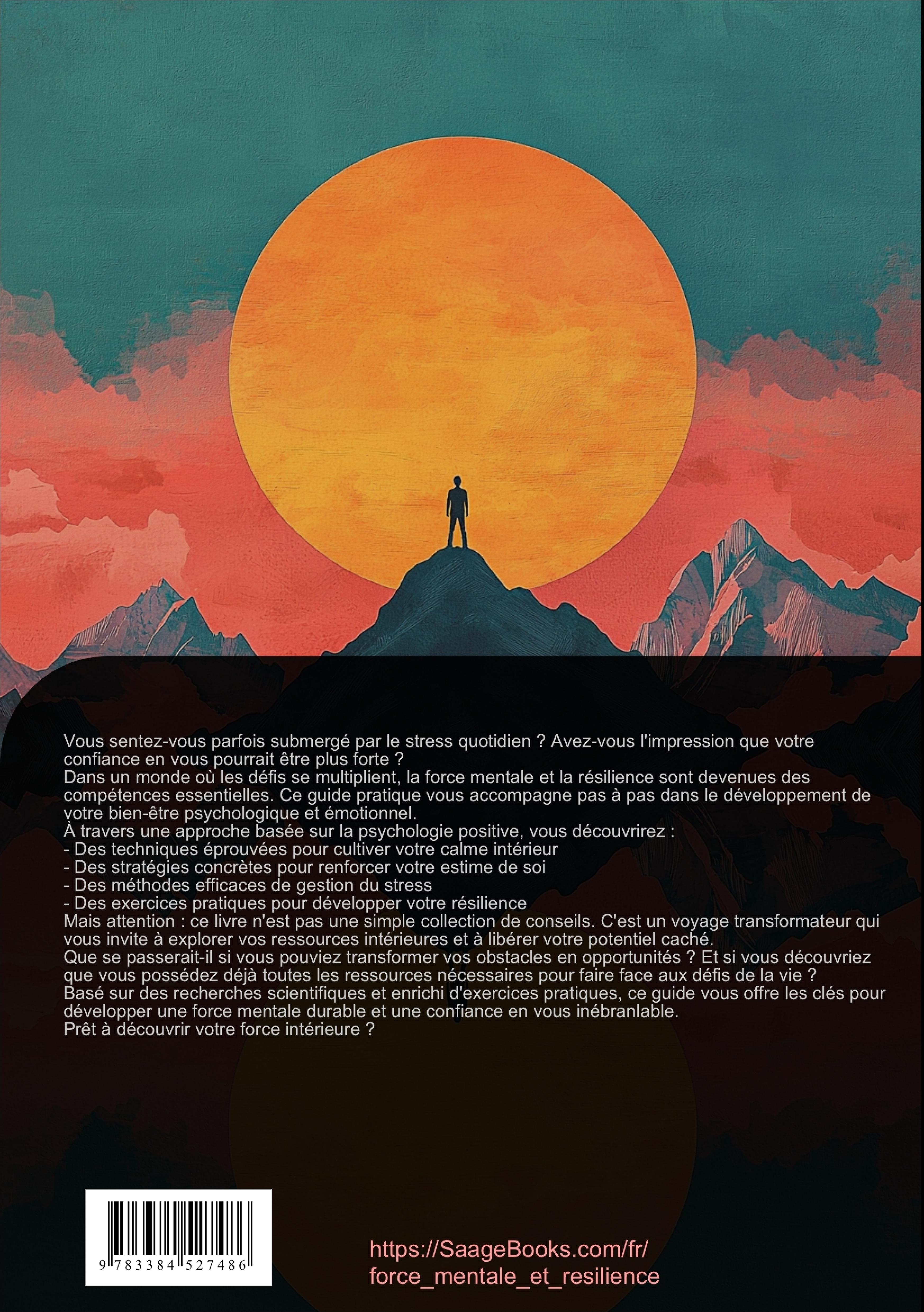 Découvrez un guide pratique complet sur le développement de la force mentale et de la résilience, conçu pour vous accompagner vers un meilleur équilibre psychologique.Ce livre vous propose une approche structurée pour:- Développer votre calme intérieur et renforcer votre confiance en soi grâce à des techniques éprouvées de psychologie positive- Maîtriser le stress quotidien et construire une résilience durable face aux défis de la vie- Cultiver des habitudes positives qui soutiennent votre santé mentale- Acquérir des outils pratiques pour l'entraînement mental et le développement personnelVous apprendrez à:- Comprendre et surmonter vos peurs pour devenir plus fort mentalement- Développer votre résilience au stress par des exercices concrets- Renforcer l'estime de soi et la confiance en soi durablement- Maintenir un équilibre émotionnel stable face aux situations difficilesLe livre aborde:- Les fondements de la force mentale et de la résilience- Les techniques de gestion du stress et de développement du calme intérieur- Les stratégies pour cultiver la pensée positive- Les méthodes pour renforcer la confiance en soi- Les exercices pratiques d'entraînement mentalQue vous souhaitiez améliorer votre bien-être personnel ou développer votre capacité à faire face aux défis, ce guide vous fournit les clés pour construire une force mentale durable et une résilience à toute épreuve.Ce livre a été créé en utilisant des technologies innovantes telles que l'Intelligence Artificielle ainsi que des outils spécialement développés - par exemple, pour la recherche d'idées, la recherche d'informations, l'écriture, la relecture, l'assurance qualité et la conception d'illustrations décoratives.Ainsi, nous souhaitons vous offrir une expérience de lecture particulièrement cohérente, moderne et d'une qualité encore supérieure.