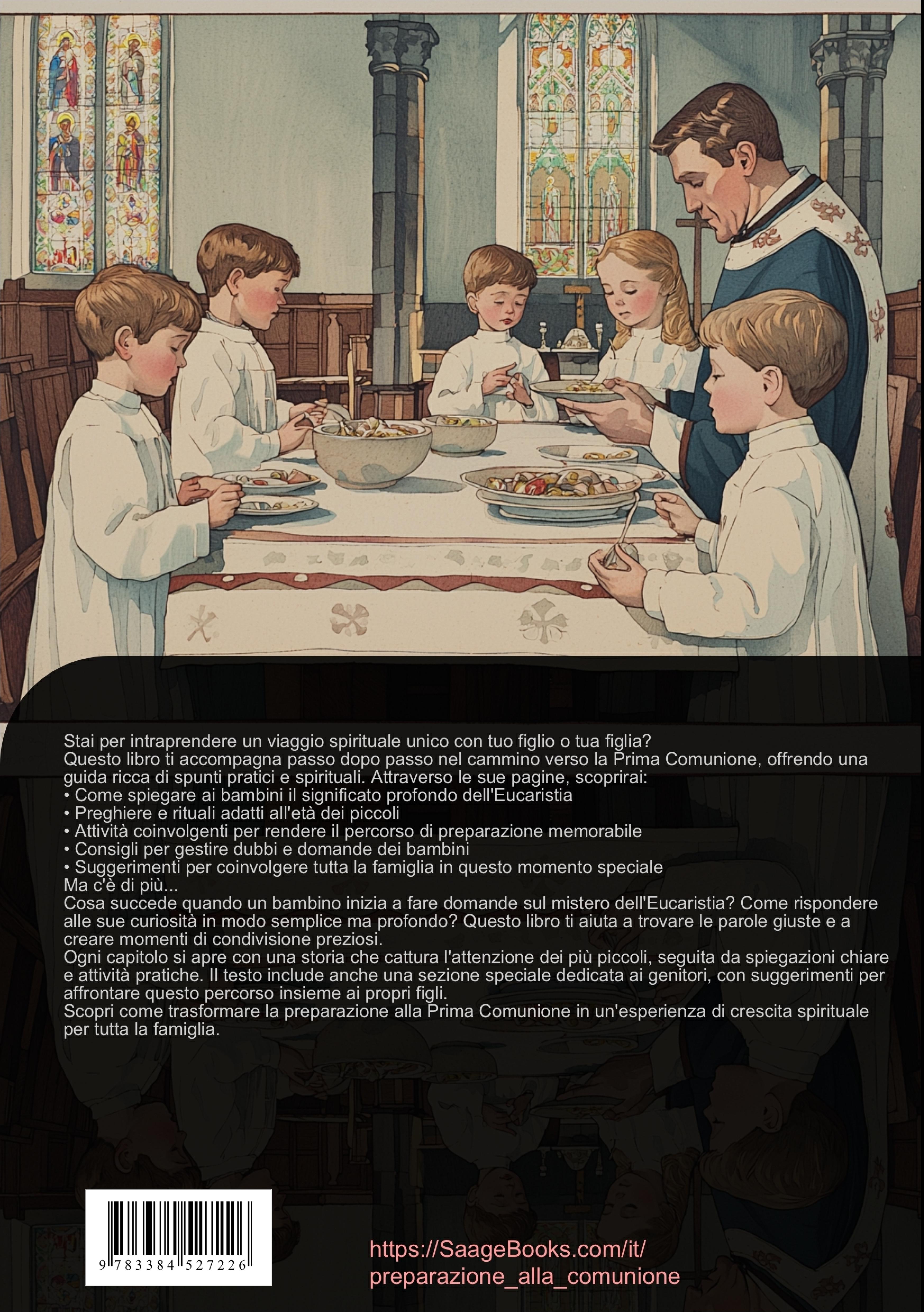 Questo libro di preparazione alla Prima Comunione è una guida pratica e spirituale pensata per accompagnare i bambini e le bambine nel loro percorso verso questo importante Sacramento.Il testo si sviluppa attraverso diverse sezioni fondamentali:- Un'introduzione al catechismo e ai principi fondamentali della fede cattolica- La spiegazione dettagliata del Sacramento della Prima Comunione- Una raccolta di preghiere essenziali e rituali della Chiesa- Attività pratiche e riflessioni per la preparazione spirituale- Guide specifiche per l'accompagnamento familiareIl libro offre:- Spiegazioni chiare e adatte ai giovani lettori- Illustrazioni che aiutano la comprensione dei concetti- Esercizi di riflessione e attività pratiche- Suggerimenti per la preparazione immediata alla cerimonia- Indicazioni per la celebrazione e il periodo successivoParticolare attenzione viene dedicata a:- Lo sviluppo della relazione personale con Dio- La comprensione del significato dell'Eucaristia- Il ruolo della famiglia nel percorso di preparazione- L'importanza della comunità parrocchialeQuesto libro di preparazione comunione rappresenta uno strumento prezioso per:- Catechisti che guidano i gruppi di preparazione- Genitori che desiderano accompagnare i propri figli- Bambini e bambine nel loro cammino di fedeIl testo include anche sezioni specifiche sulla preparazione alla Prima Confessione e suggerimenti pratici per vivere al meglio il giorno della celebrazione.Questo libro è stato creato utilizzando tecnologie innovative come l'Intelligenza Artificiale e strumenti sviluppati appositamente - ad esempio, nella ricerca di idee, nella ricerca, nella scrittura, nella redazione, nel controllo qualità e nella progettazione di illustrazioni decorative.In questo modo, vogliamo offrirvi un'esperienza di lettura particolarmente coerente, moderna e di qualità ancora superiore.