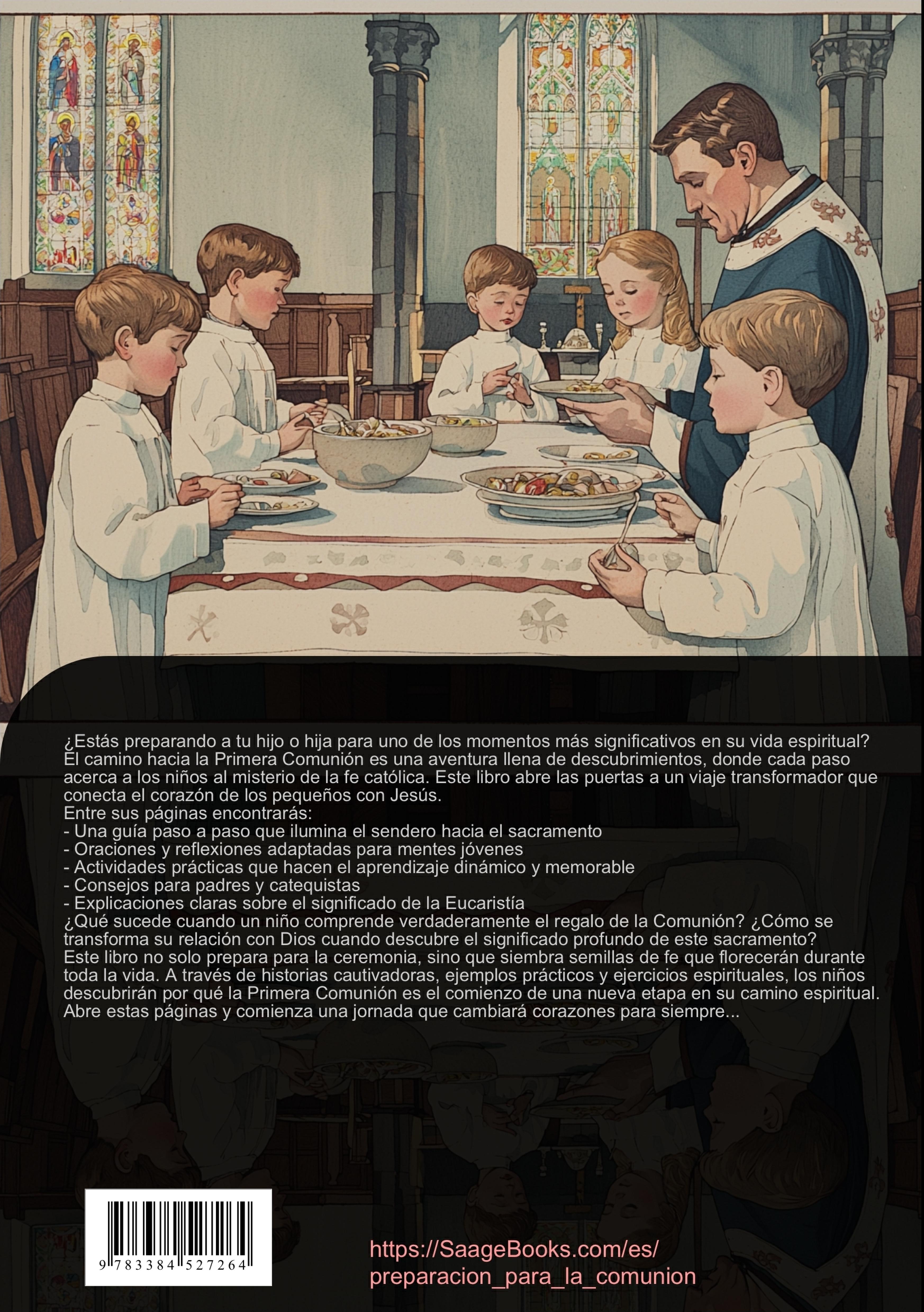 Este libro de preparación para la primera comunión es una guía práctica y detallada que acompaña a niños y niñas en su camino a la Primera Comunión católica. Diseñado para facilitar la comprensión y el aprendizaje, ofrece una estructura clara y pedagógica.El contenido se divide en secciones fundamentales:- Fundamentos del catecismo católico explicados de manera sencilla y adaptada- Oraciones básicas y su significado en la vida cristiana- Guía paso a paso para la preparación espiritual- Explicación de los sacramentos, con énfasis en la Eucaristía- Actividades prácticas para reforzar el aprendizaje- Sección especial sobre la confesión y su preparaciónEl libro incluye elementos específicos para:- Desarrollo de la relación personal con Dios- Participación activa en la comunidad parroquial- Preparación para la ceremonia- Guía para padres y familiares en el acompañamientoCaracterísticas destacadas:- Ilustraciones que ayudan a la comprensión- Lenguaje adaptado para niños- Espacios para anotaciones personales- Oraciones y reflexiones diarias- Actividades para realizar en familiaEste libro de comunión para niño y niña se convierte en una herramienta valiosa que no solo prepara para el sacramento, sino que también sirve como recuerdo especial de este momento importante en la vida de fe.Ideal para:- Catequistas- Padres que acompañan la preparación- Niños y niñas que se preparan para recibir el sacramento- Parroquias y grupos de catequesisEste libro ha sido creado utilizando tecnologías innovadoras como la Inteligencia Artificial y herramientas especialmente desarrolladas, por ejemplo, en la búsqueda de ideas, la investigación, la escritura, la edición, el control de calidad y el diseño de ilustraciones decorativas.De esta manera, queremos ofrecerle una experiencia de lectura especialmente coherente, moderna y de mayor calidad.