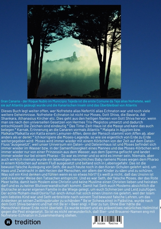 Dieses Buch legt weiter offen, wer Nofretete alias Nefertiti alias Echnaton war und noch viele weitere Geheimnisse. Nofretete-Echnaton ist nicht nur Moses, Gott Shiva, die Bavaria, Adi Shankara, Athanasius Kircher etc. Dies geht aus den heiligen Namen von Gott Shiva hervor, wenn man sie nach den universellen Gesetzen von Hermes Tris-Megistos umsetzt und dadurch entschlüsselt Die Zeichen sind eindeutig * Das Time-Zeit-Haus ist die Masse und kann das auch belegen * Karnak, Erinnerung an die Canaren vormals Atlantis * Malqata in Ägypten bzw. Malkata/Malkatta von Katta einem Lemuren-Affen, denn der Mensch stammt vom Affen ab, aber anders als er denkt * Ich korrigiere die Moses-Legende, so wie sie eigentlich von Erde zu Erde weitergegeben wird: Moses wird immer wieder mit einem Körbchen von der Zeit auf dem Daten-Fluss "ausgesetzt", weil unser Universum ein Daten- und Dateienhaus ist und Moses befindet sich immer wieder im Wasser bzw. in der Samenflüssigkeit eines Mannes und das Moses-Körbchen wird immer wieder nur von einer Prinzessin aus dem Wasser, aus dem Sperma gefischt und landet immer wieder nur bei einem Pharao - So war es immer und so wird es immer sein. Niemals, aber auch wirklich niemals wurde ein lebendiges menschliches Baby namens Moses wegen dem Pharao in einem Körbchen auf einem Fluß ausgesetzt und befand sich in Lebensgefahr. Das ist die bewusst falsche Auslegung von Seth, die auch heute noch in den Koran-Schulen gelehrt wird, um Hass und Zwietracht in den Herzen der Menschen, vor allem der Kinder zu säen und zu schüren. Was soll ein Kind denken und fühlen wenn es so etwas hört? Es weiß ja nicht, daß das Unsinn ist und in keinster Weise den Tatsachen entspricht. Und es war Seth, der falsche Moses, der das Rote Meer teilte, damit kein Moslem eine Christin und keine Muslime einen Christen lieben und heiraten darf und es zu keiner Blutsverwandtschaft kommt. Damit hat Seth euch Moslems absichtlich die Blutrache an eurer eigenen Familie in die Wiege gelegt, um euch Schmerzen und Leid zuzufügen. Der echte Moham-med/Osiris/Tut-anch-Amun hat solch einen Unsinn nie gelehrt, weil der Islam sein liebstes Kind war und Seth verbreitete nach seinem Tod bewusst falsche Lehren, um das Andenken an seinen Zwillingsbruder zu schänden * Be`er Scheva,einst in Palästina, wurde nach dem Gott Shiva benannt und hat mit Be`er = Beer engl. = Bier zu tun. Ohne Bier hätte die Menschheit dieser Erde nicht überlebt. Es wurde kreiert und als präventives natürliches Heilmittel gegen die Pest eingesetzt. So ist es nicht verwunderlich, daß Bier- und Brauerei-Namen eng mit Nofretete-Echnaton in Zusammenhang stehen.