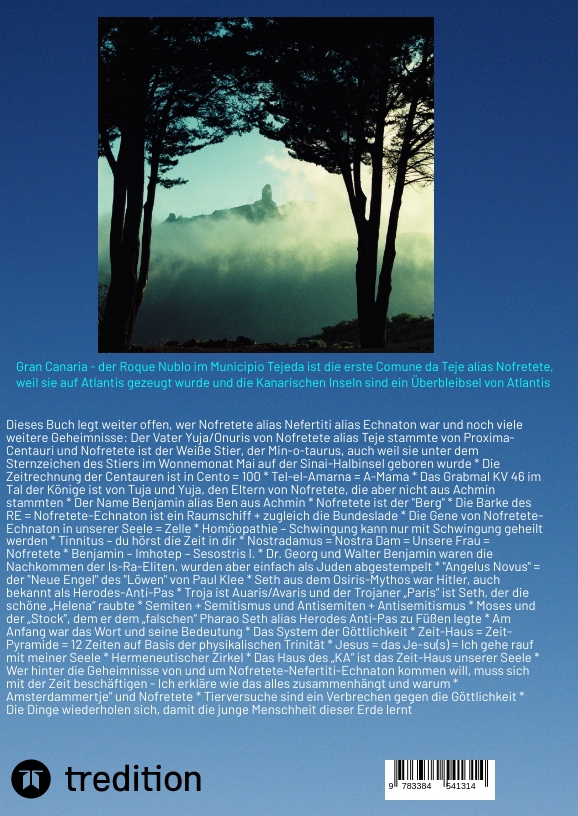 Dieses Buch legt weiter offen, wer Nofretete alias Nefertiti alias Echnaton war und noch viele weitere Geheimnisse:Der Vater Yuja/Onuris von Nofretete alias Teje stammte von Proxima-Centauri und Nofretete ist der Weiße Stier, der Min-o-taurus, auch weil sie unter dem Sternzeichen des Stiers im Wonnemonat Mai auf der Sinai-Halbinsel geboren wurde * Die Zeitrechnung der Centauren ist in Cento = 100 * Tel-el-Amarna = A-Mama * Das Grabmal KV 46 im Tal der Könige ist von Tuja und Yuja, den Eltern von Nofretete, die aber nicht aus Achmin stammten * Der Name Benjamin alias Ben aus Achmin * Nofretete ist der "Berg" * Die Barke des RE = Nofretete-Echnaton ist ein Raumschiff + zugleich die Bundeslade * Die Gene von Nofretete-Echnaton in unserer Seele = Zelle * Homöopathie - Schwingung kann nur mit Schwingung geheilt werden * Tinnitus - du hörst die Zeit in dir * Nostradamus = Nostra Dam = Unsere Frau = Nofretete * Benjamin - Imhotep - Sesostris I. * Dr. Georg und Walter Benjamin waren die Nachkommen der Is-Ra-Eliten, wurden aber einfach als Juden abgestempelt * "Angelus Novus" = der "Neue Engel" des "Löwen" von Paul Klee * Seth aus dem Osiris-Mythos war Hitler, auch bekannt als Herodes-Anti-Pas * Troja ist Auaris/Avaris und der Trojaner "Paris" ist Seth, der die schöne "Helena" raubte * Semiten + Semitismus und Antisemiten + Antisemitismus * Moses und der "Stock", dem er dem "falschen" Pharao Seth alias Herodes Anti-Pas zu Füßen legte * Am Anfang war das Wort und seine Bedeutung * Das System der Göttlichkeit * Zeit-Haus = Zeit-Pyramide = 12 Zeiten auf Basis der physikalischen Trinität * Jesus = das Je-su(s) = Ich gehe rauf mit meiner Seele * Hermeneutischer Zirkel * Das Haus des "KA" ist das Zeit-Haus unserer Seele * Wer hinter die Geheimnisse von und um Nofretete-Nefertiti-Echnaton kommen will, muss sich mit der Zeit beschäftigen - Ich erkläre wie das alles zusammenhängt und warum * Amsterdammertje" und Nofretete * Tierversuche sind ein Verbrechen gegen die Göttlichkeit * Die Dinge wiederholen sich, damit die junge Menschheit dieser Erde lernt