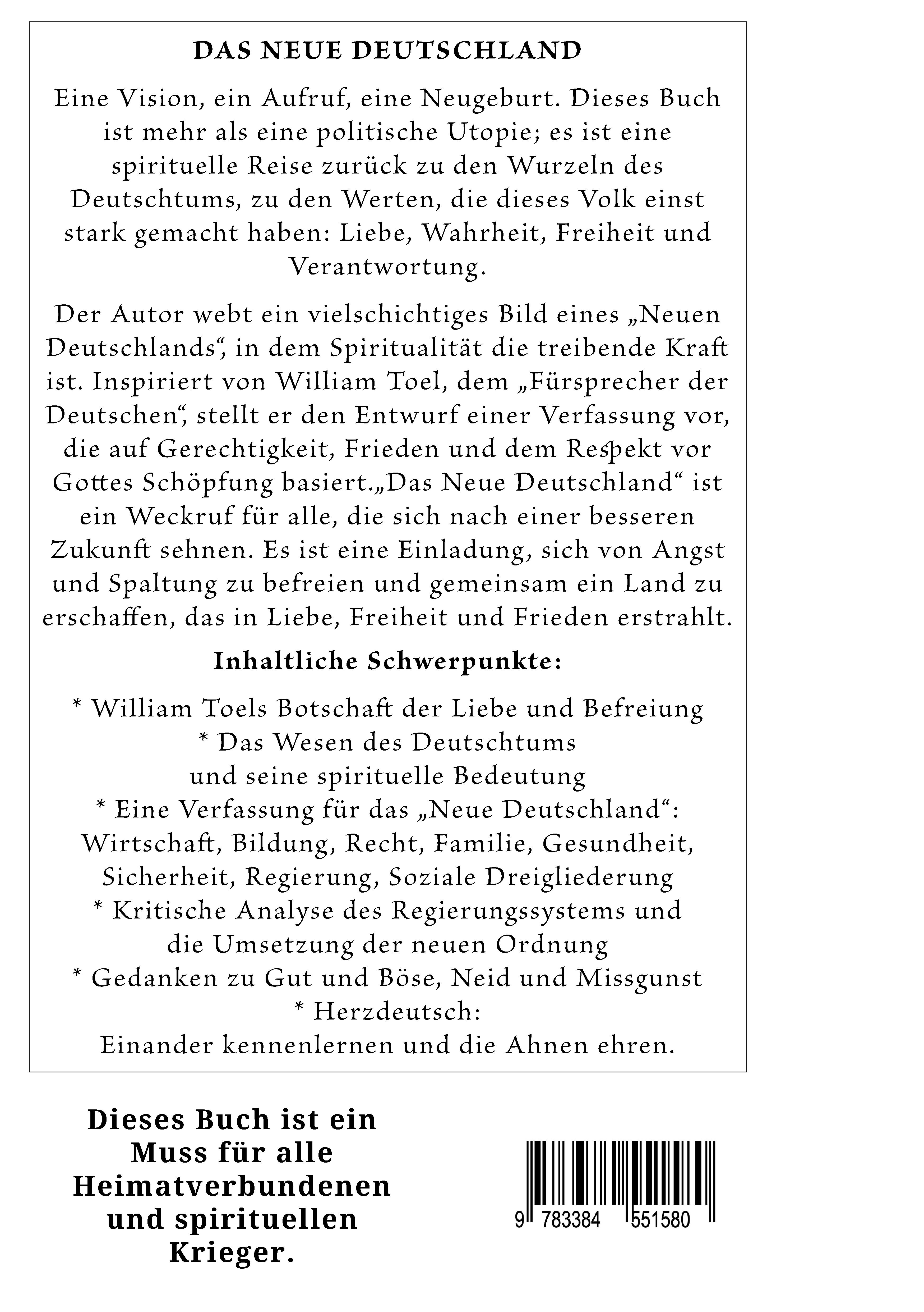 | Schlagworte | Deutsche Identität • Deutschtum • Neues Deutschland • Soziale Dreigliederung • Spiritualität • Verfassung • Wahrheit • Werte • William Toel • Zukunftsvision |