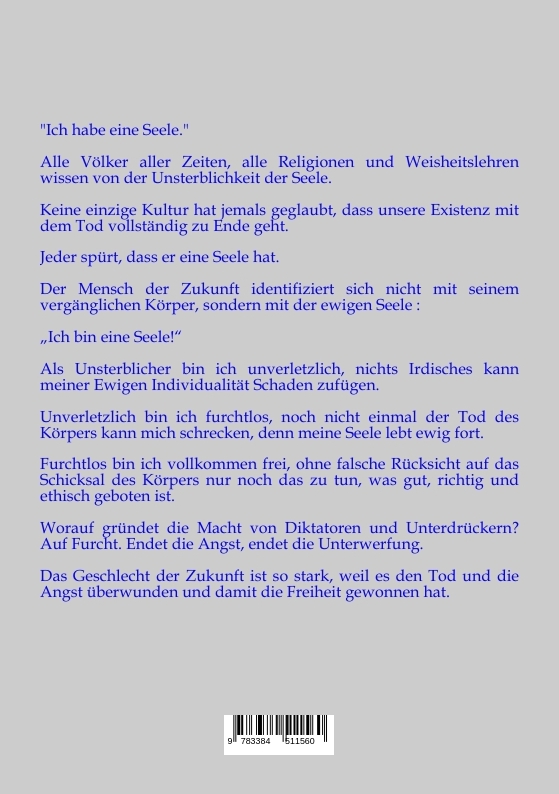 Alle Völker aller Zeiten, alle Religionen und Weisheitslehren wussten von der Unsterblichkeit der Seele. Keine einzige Kultur hat jemals geglaubt, dass unsere Existenz mit dem Tod vollständig zu Ende geht.Der Mensch kann auch spüren, dass er eine Seele hat.Es ist vernünftig, sich nicht mit seinem vergänglichen Körper, sondern mit der ewigen Seele zu identifizieren:"Ich bin eine Seele!"Unsterblich und unverletzlich, damit unbesiegbar, also furchtlos und vollkommen frei.
