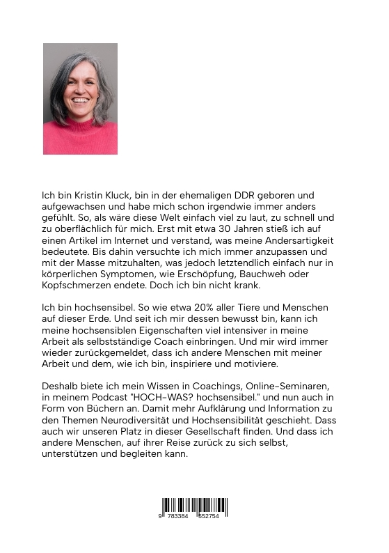 Geboren und aufgewachsen in der ehemaligen DDR habe ich mich schon immer irgendwie anders und oft nicht dazugehörig gefühlt. Dass das, was ich bin, einen Namen hat, erfuhr ich erst viele Jahre später. Mit 30 Jahren etwa las ich im Internet einen Artikel über Hochsensibilität und fand mich darin zu 100% wieder. Seitdem beschäftige ich mich ganz intensiv mit mir selbst und meiner eigenen Hochsensibilität und beziehe all mein Wissen und meine Erfahrungen auch in meine Arbeit als Coach mit ein. Mein Herzensprojekt ist außerdem mein Podcast "HOCH-WAS? hochsensibel.", mit dem ich viele Menschen erreichen kann und mir auch immer wieder spannende Gäste zum Thema vor das Mikrofon hole. Außerdem habe ich schon immer gern Texte geschrieben und fasse mein Wissen nun endlich auch in Büchern zusammen. Das Feedback zahlreicher hochsensibler Menschen, das mich immer wieder erreicht, bestätigt und bestärkt mich darin, mit dem Thema Hochsensibilität und Neurodiversität auch weiterhin nach außen zu gehen. Mehr zu mir und meiner Arbeit findest du außerdem auf meiner Website: www.kristin-kluck.de.