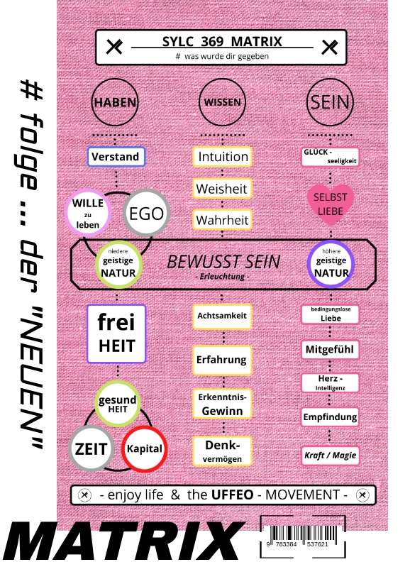 # folge ... der "NEUEN" MATRIX - wenn du an FREIHEIT und den 27 BASIS-WERTEN für die eigene "geistige" Entwicklung interessiert bist. Womöglich sogar mit dem Ziel : die wahre Bedeutung aller 27 essentiell wichtigen "WERTE des Lebens", für dich SELBST besser kennenlernen zu wollen ?... um auf Basis eines selbst erworbenen & eigenständig überprüften WISSENS, den Schleier der "gesellschaftlich-weltlichen" Illusion eben noch ein Stückchen weiter lüften zu dürfen. SELBSTERKENNTNIS & SELBSTBESTIMMUNG stellen infolgedessen lediglich weitere mit großer Freude anzustrebende und mit großer Sorgfalt zu erhaltende Eckpfeiler des eigenen Lebens dar. Während dein Verständnis für "wahre" FREIHEIT, "wahres" SEIN wie das Erlangen von subjektiven & objektiven WAHRHEITEN, auf deinem individuellen "Weg zu dir SELBST" - quasi zu deinem ständigen Begleiter wird. WEIL : sich dein UNTERSCHEIDUNGSVERMÖGEN, in Bezug auf den MENSCHEN in dir und deine MASKE bzw. die PERSON davor, von Tag zu Tag sozusagen wie von selbst weiter & weiter schärft.Laut Ansicht des Autoren "DADAL", können ausnahmslos alle anderen "WERTE des Lebens", denen in der SYLC 369 MATRIX beschriebenen 27 BASIS-WERTE mit Leichtigkeit unter- bzw. zugeordnet werden. Mit Hilfe dieser essentiellen WERTE, vermag der Leser also eine gewisse Orientierung im eigenen Leben zu erlangen, insofern dieser deren geistige Substanz für sich selbst bereits einigermaßen begriffen hat. Nur - für den den Fall, dass der eigene "Kopf" urplötzlich mal wieder durch zu drehen scheint ... Mit der Veröffentlichung der Buchreihe "SYLC 369 MATRIX", hinterlässt der Autor seinen Nachkommen wie Mitmenschen also eine WISSENS-KONPOSITION - welche er sich für sein Kindesalter und insbesondere für die direkt daran angliedernde Jugend, von ganzem Herzen gewünscht hätte, um zumindest in dieser "wissbegierigen & tollkühnen" Zeit - eine Art "LEITFADEN" für das Leben zur Hand zu haben.Auf diesem Wege wäre er vielleicht schon eher in der Lage gewesen, all jenen "künstlich hochstilisierten" WERTEN des gesellschaftlich-weltlichen Daseins, etwas weniger Raum zu geben - indem er sich auf der individuellen Suche nach dem "SINN DES LEBENS", eben einfach mehr den "wahren" WERTEN des Lebens gewidmet hätte ... ?Nicht dass er glauben würde - jenes WISSEN bereits in seinen jungen Jahren, selbst in seiner Tiefe vollumfänglich hätte begreifen können ... nein, ganz bestimmt nicht ... zumindest ABER - hätte er einen auf in geistiger Hinsicht "höher" gestellten WERTEN beruhenden und ineinander verschachtelten KOMPASS zur Hand gehabt. An wessen Inhalt, wie z.B. den plakativen 27 BASIS-WERTEN, er sich in ungewissen Situationen durchaus hätte orientieren oder worüber er gemeinsam mit seinen Leuten, sinnvoll wie sinnlos hätte philosophieren können.Anstatt einfach nur so und ohne wahren HALT "in dieses geheimnisvolle Leben geworfen zu werden", in welchem angeblich nur all jene WERTE von Bedeutung sein sollen, welche von all den Leuten um einen herum oftmals nur fälschlicher Weise aber ebenso gezwungener Maßen ... vorgelebt werden ?Wenngleich der wahre "SINN DES LEBENS" - für ein wahres Menschen-Kind schon eher darin zu liegen scheint, das eigene Potenzial zum Wohle aller Mitmenschen zur Blüte zu bringen ohne hierbei die SELBSTLIEBE jemals außer Acht zu lassen, insofern ein Menschen-Kind für sich selbst bereits begriffen hat - dass diese von der Selbstverliebtheit grundsätzlich zu unterscheiden ist.Also - bist du bereit ?