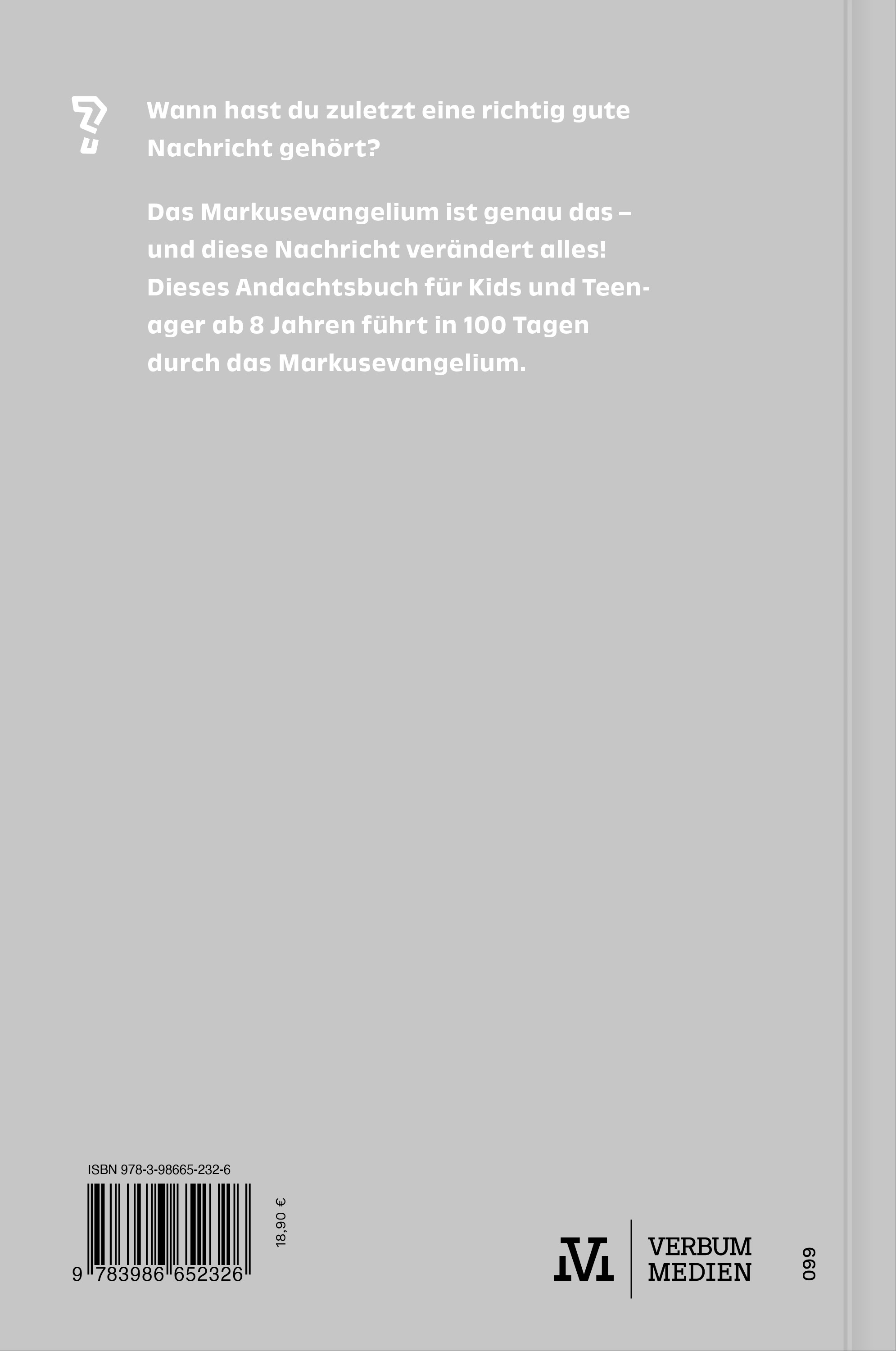 Wann hast du zuletzt eine richtig gute Nachricht gehört? Das Markusevangelium ist genau das – und diese Nachricht verändert alles! Dieses Andachtsbuch für Kids und Teenager ab 8 Jahren führt in 100 Tagen durch das Markusevangelium.