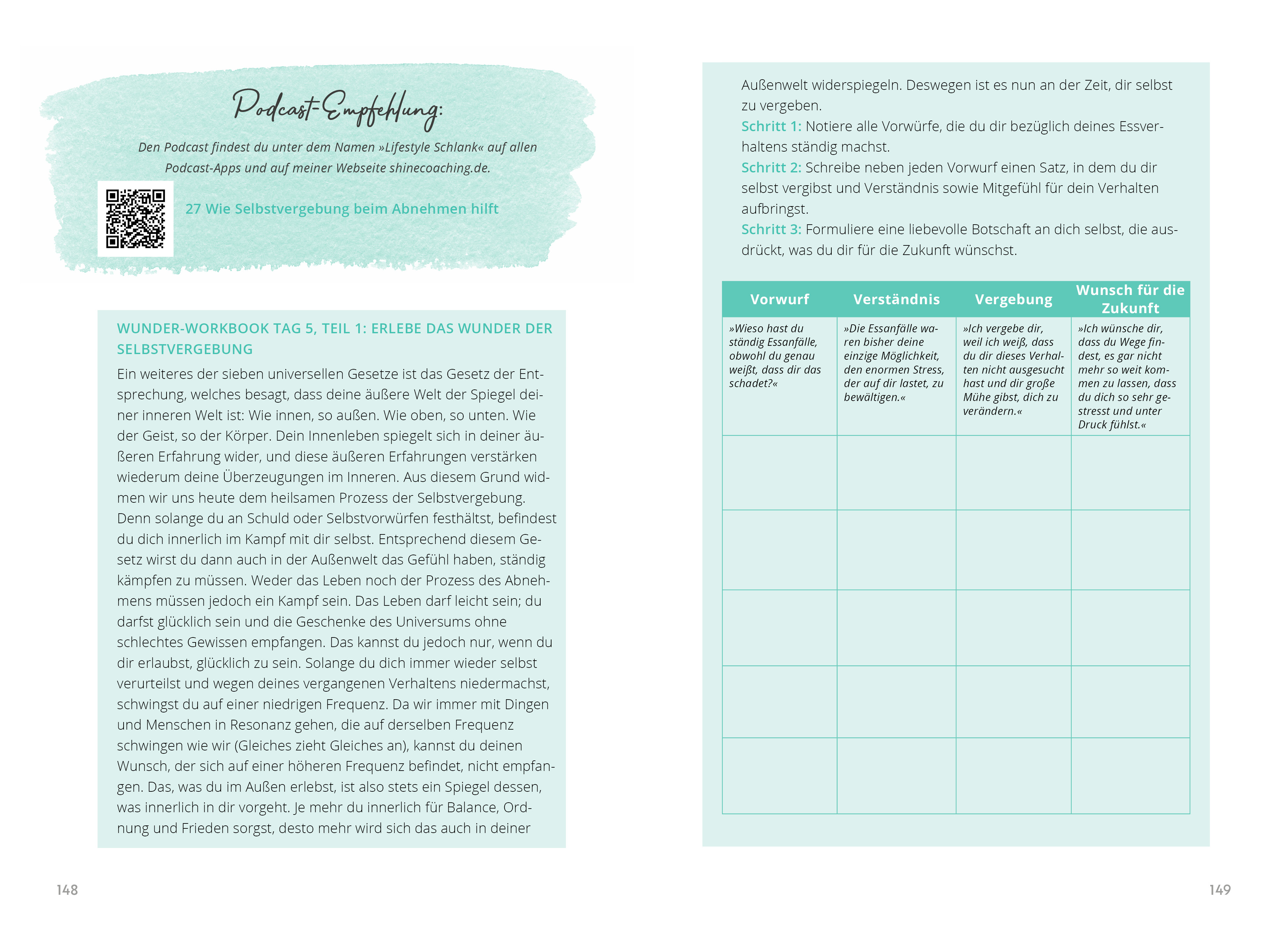 - Das 7-Tage-Programm: Ein strukturierter Fahrplan mit täglichen Reflexionsübungen, Ritualen und Journaling-Methoden hilft dir, alte Essgewohnheiten und Denkmuster schnell zu erkennen, loszulassen und durch neue, förderliche zu ersetzen.