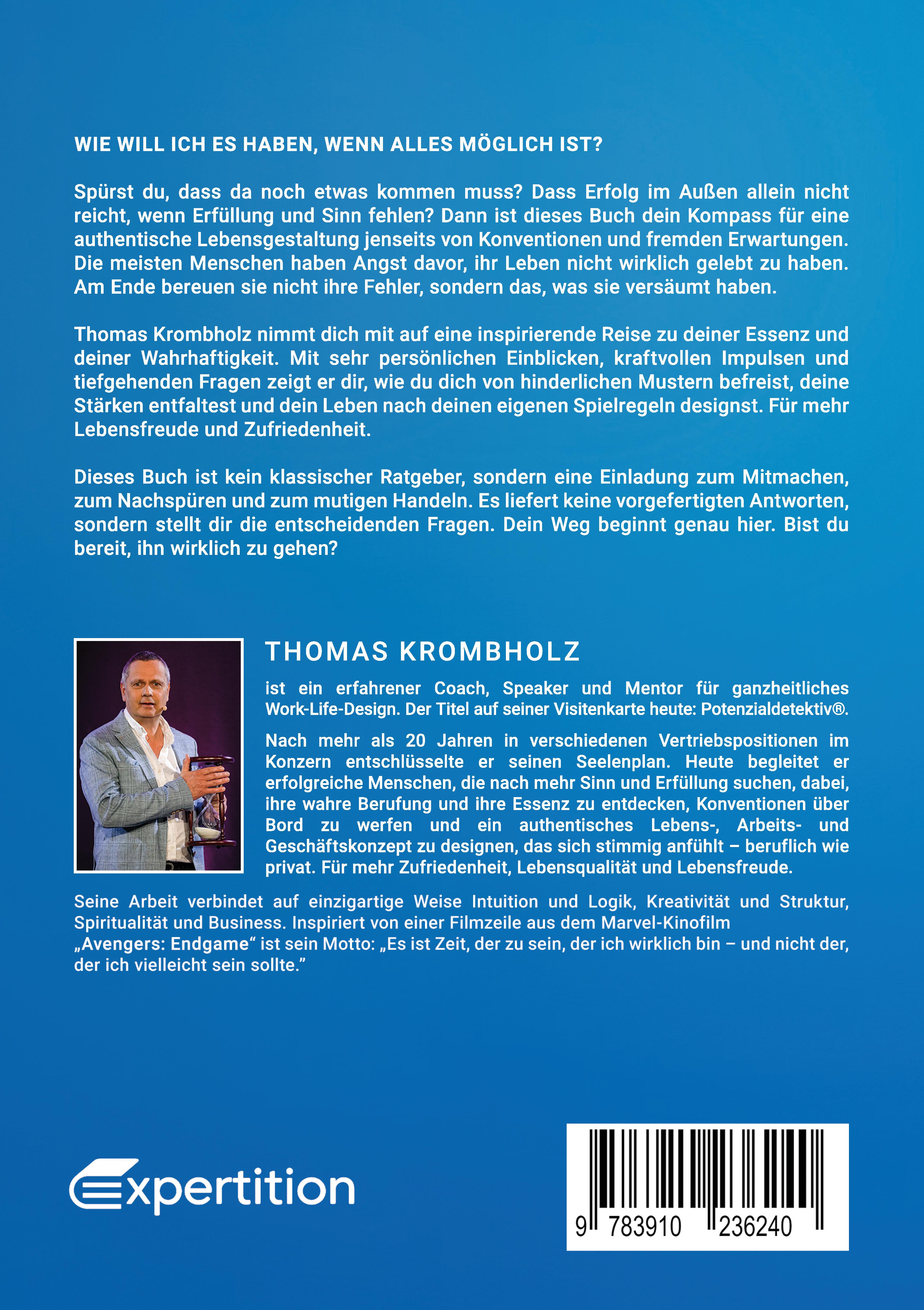Thomas Krombholz – Potenzialdetektiv® & Experte für ganzheitliches Work-Life-Design Über den Autor: Thomas Krombholz ist Coach, Speaker und Mentor für Menschen, die sich nach einem erfüllten, authentischen Leben sehnen. Nach über 20 Jahren in verschiedenen Vertriebspositionen in der Konzernwelt erkannte er, dass er nicht länger nach äußeren Erwartungen leben wollte. Er entschlüsselte seinen eigenen Seelenplan und entdeckte seine wahre Berufung: Menschen dabei zu unterstützen, ihre Potenziale zu erkennen und ihr eigenes Lebens- und Arbeitsmodell zu gestalten – fernab von starren Konventionen. Seine Arbeit als Potenzialdetektiv® kombiniert Intuition und Logik, Kreativität und Struktur, Spiritualität und Business. Er hilft seinen Klienten, sich von gesellschaftlichen Zwängen zu lösen und ihre einzigartigen Talente selbstbewusst zu leben. Sein Motto, inspiriert aus Avengers: Endgame, lautet: "Es ist Zeit, der zu sein, der ich wirklich bin – und nicht der, der ich vielleicht sein sollte." Seine Mission: Mit seinem Wissen, seinen eigenen Erfahrungen und seinen einzigartigen Methoden begleitet er Menschen auf ihrem Weg zu einem selbstbestimmten, sinnerfüllten Leben. Er lädt dazu ein, mutig zu sein, echte Entscheidungen zu treffen und das Leben bewusst nach den eigenen Vorstellungen zu gestalten. Mehr über Thomas Krombholz: 🌍 Website: thomas-krombholz.com