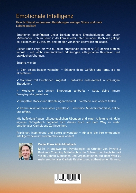 Ich bin Daniel Franz Albin Mittelbach – Coach, Trainer und überzeugt davon, dass emotionale Intelligenz ein echter Gamechanger im Alltag ist. Sie hilft uns, mit uns selbst ins Reine zu kommen, andere besser zu verstehen und Beziehungen bewusster zu gestalten – sei es im Beruf, in der Familie oder im Freundeskreis. Mein Hintergrund vereint wirtschaftliches und psychologisches Know-how: Ich habe einen Bachelor in Betriebswirtschaft (B.A.), einen Master of Science in Angewandter Psychologie (M.Sc.) sowie eine Weiterbildung zum diplomierten Qualitätsmanager NDS HF absolviert. In über 15 Jahren als Führungskraft in internationalen Unternehmen habe ich hautnah erlebt, wie stark zwischenmenschliche Fähigkeiten über den Erfolg eines Teams oder Projekts entscheiden – und wie oft genau diese Kompetenzen unterschätzt werden. Heute begleite ich Menschen und Teams in ihrer persönlichen und beruflichen Entwicklung. Mein Ansatz ist praxisnah, alltagstauglich und stellt den Menschen in den Mittelpunkt. Mehr über mich und meine Arbeit findest du unter: www.pbc-mittelbach.com
