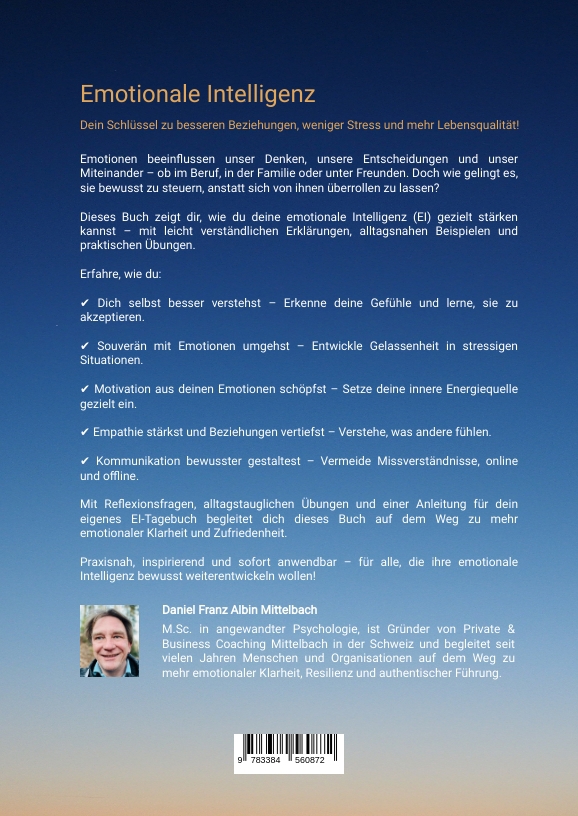 Ich bin Daniel Franz Albin Mittelbach – Coach, Trainer und überzeugt davon, dass emotionale Intelligenz ein echter Gamechanger im Alltag ist. Sie hilft uns, mit uns selbst ins Reine zu kommen, andere besser zu verstehen und Beziehungen bewusster zu gestalten – sei es im Beruf, in der Familie oder im Freundeskreis. Mein Hintergrund vereint wirtschaftliches und psychologisches Know-how: Ich habe einen Bachelor in Betriebswirtschaft (B.A.), einen Master of Science in Angewandter Psychologie (M.Sc.) sowie eine Weiterbildung zum diplomierten Qualitätsmanager NDS HF absolviert. In über 15 Jahren als Führungskraft in internationalen Unternehmen habe ich hautnah erlebt, wie stark zwischenmenschliche Fähigkeiten über den Erfolg eines Teams oder Projekts entscheiden – und wie oft genau diese Kompetenzen unterschätzt werden. Heute begleite ich Menschen und Teams in ihrer persönlichen und beruflichen Entwicklung. Mein Ansatz ist praxisnah, alltagstauglich und stellt den Menschen in den Mittelpunkt. Mehr über mich und meine Arbeit findest du unter: www.pbc-mittelbach.com