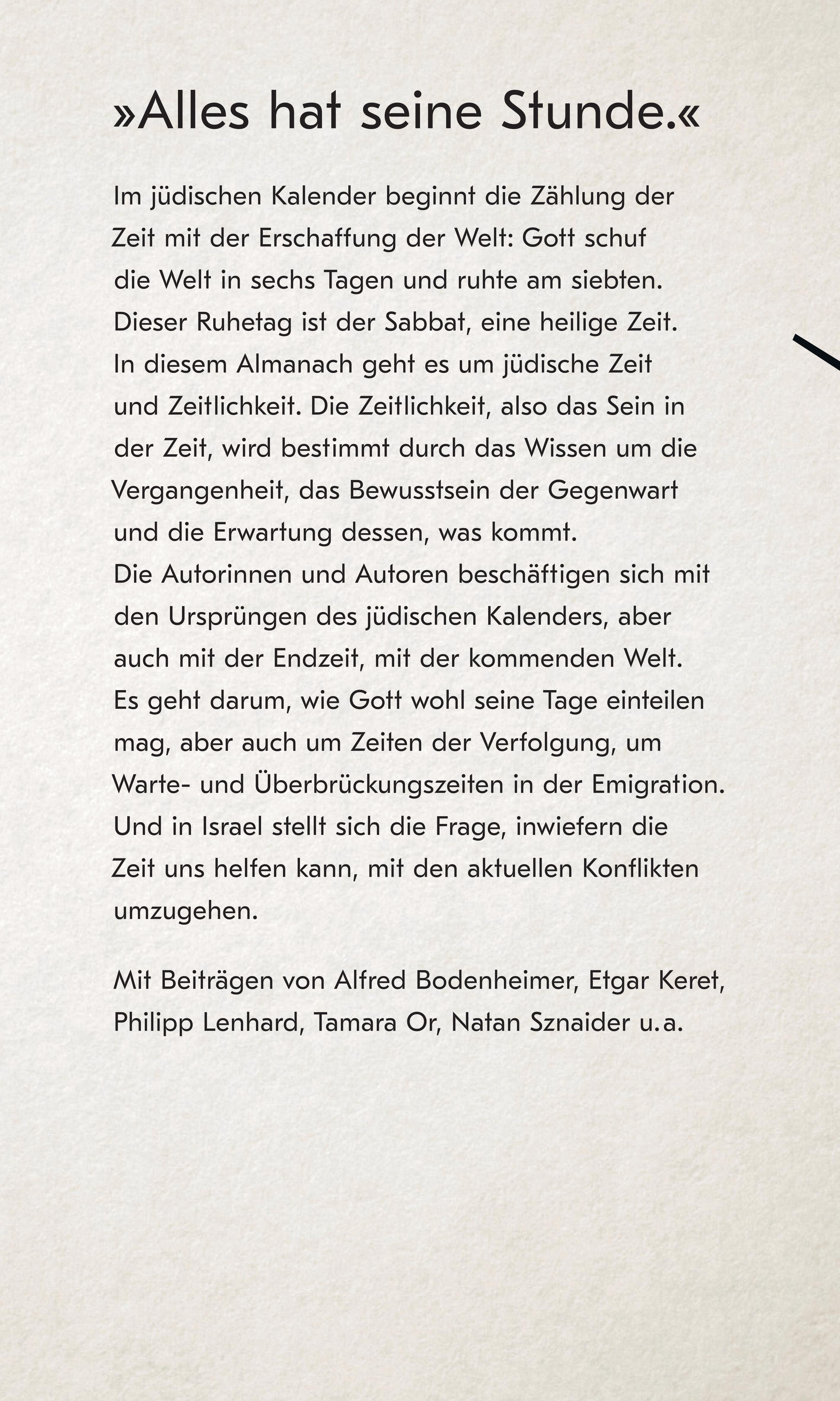 In diesem Almanach geht es um jüdische Zeit und Zeitlichkeit. Die Zeitlichkeit, also das Sein in der Zeit, wird bestimmt durch das Wissen um die Vergangenheit, das Bewusstsein der Gegenwart und die Erwartung dessen, was kommt. Die Autorinnen und Autoren beschäftigen sich mit den Ursprüngen des jüdischen Kalenders, aber auch mit der Endzeit: Haolam Habah, die kommende Welt. Es geht darum, wie Gott wohl seine Tage einteilen mag, aber auch um Zeiten der Verfolgung, um Warte- und Überbrückungszeiten in der Emigration, ebenso wie um Zukunftsvorstellungen und die Frage, ob sich verlorene Zeit wieder gut machen lasse.