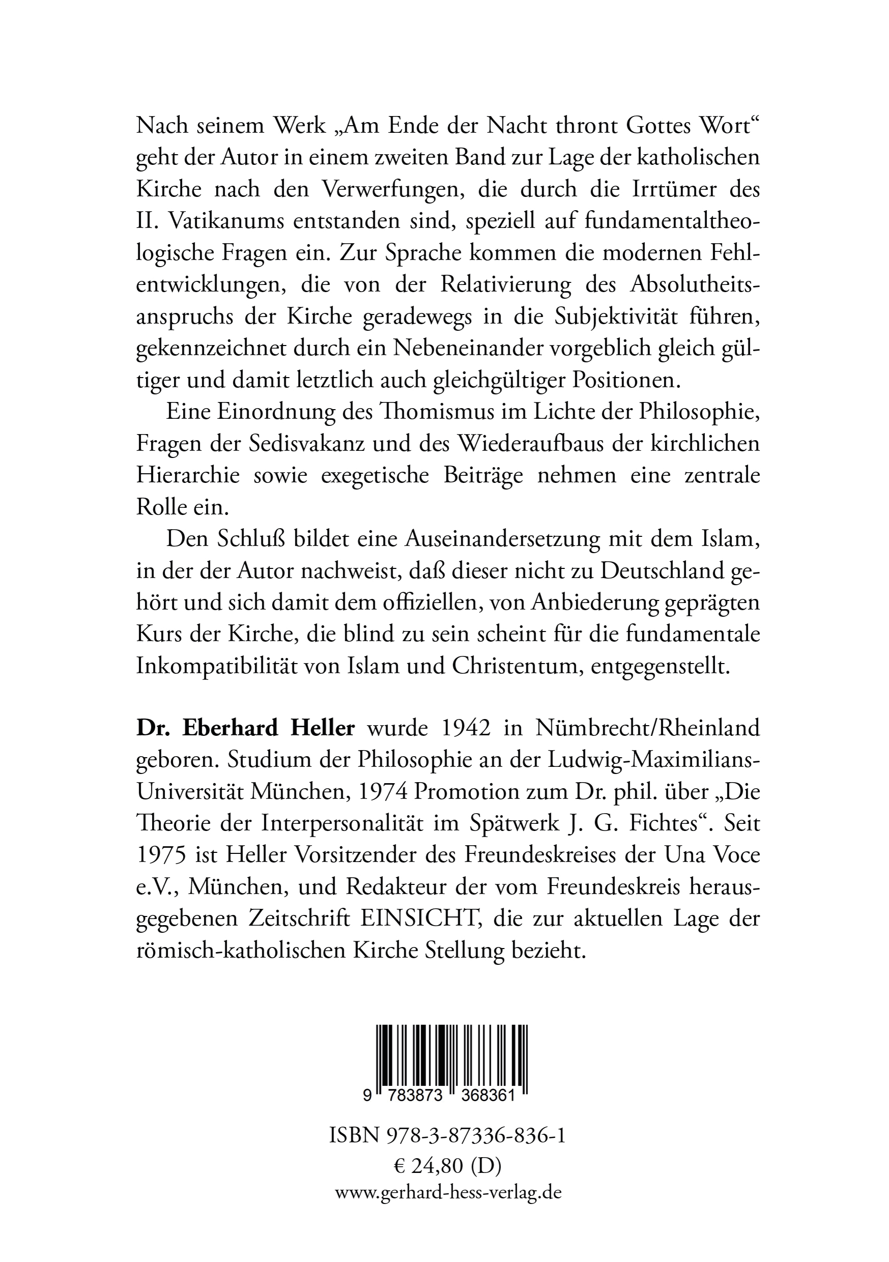 Nach seinem Werk "Am Ende der Nacht thront Gottes Wort" geht der Autor in einem zweiten Band zur Lage der katholischen Kirche nach den Verwerfungen, die durch die Irrtümer des II. Vatikanums entstanden sind, speziell auf fundamentaltheologische Fragen ein. Zur Sprache kommen die modernen Fehlentwicklungen, die von der Relativierung des Absolutheitsanspruchs der Kirche geradewegs in die Subjektivität führen, gekennzeichnet durch ein Nebeneinander vorgeblich gleich gültiger und damit letztlich auch gleichgültiger Positionen. Eine Einordnung des Thomismus im Lichte der Philosophie, Fragen der Sedisvakanz und des Wiederaufbaus der kirchlichen Hierarchie sowie exegetische Beiträge nehmen eine zentrale Rolle ein. Den Schluß bildet eine Auseinandersetzung mit dem Islam, in der der Autor nachweist, daß dieser nicht zu Deutschland gehört und sich damit dem offiziellen, von Anbiederung geprägten Kurs der Kirche, die blind zu sein scheint für die fundamentale Inkompatibilität von Islam und Christentum, entgegenstellt.