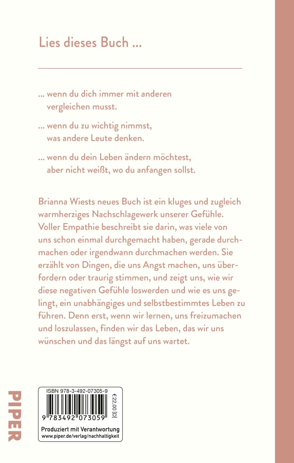 Brianna Wiests neues Buch ist ein kluges und zugleich warmherziges Nachschlagewerk unserer Gefühle. Voller Empathie beschreibt sie darin, was viele von uns schon einmal durchgemacht haben, gerade durchmachen oder irgendwann durchmachen werden. Sie erzählt von Dingen, die uns Angst machen, uns überfordern oder traurig stimmen, und zeigt uns, wie wir diese negativen Gefühle loswerden und wie es uns gelingt, ein unabhängiges und selbstbestimmtes Leben zu führen. Denn wenn wir lernen, uns freizumachen und loszulassen, finden wir das Leben, das wir uns wünschen und das längst auf uns wartet.