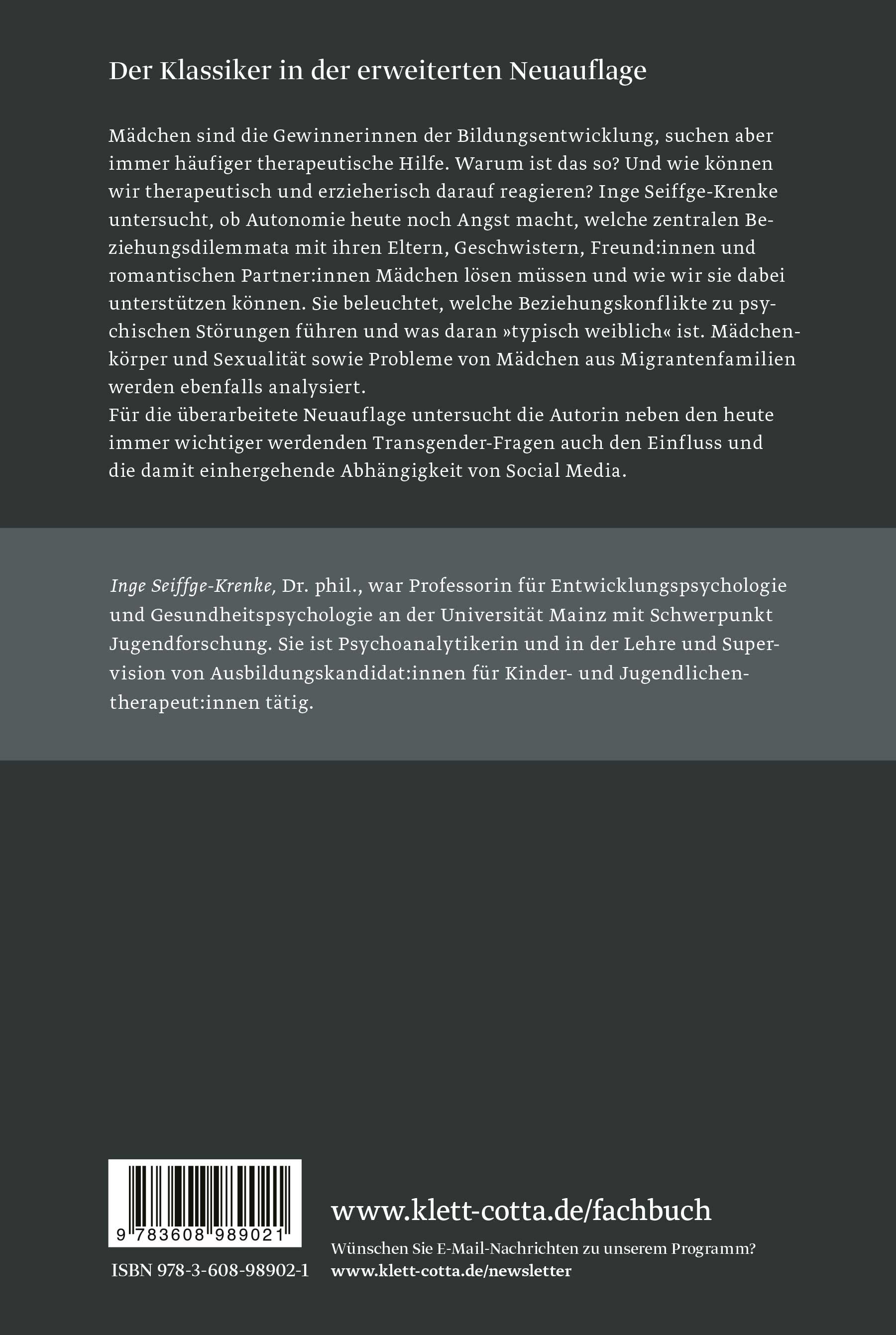 Inge Seiffge-Krenke untersucht, ob Autonomie heute noch Angst macht, welche zentralen Beziehungsdilemmata mit ihren Eltern, Geschwistern, Freunden und romantischen Partnern Mädchen lösen müssen und wie wir sie dabei unterstützen können. Sie beleuchtet, welche Beziehungskonflikte zu psychischen Störungen führen und was daran »typisch weiblich« ist. Mädchenkörper und Sexualität sowie Probleme von Mädchen aus Migrantenfamilien werden ebenfalls analysiert.