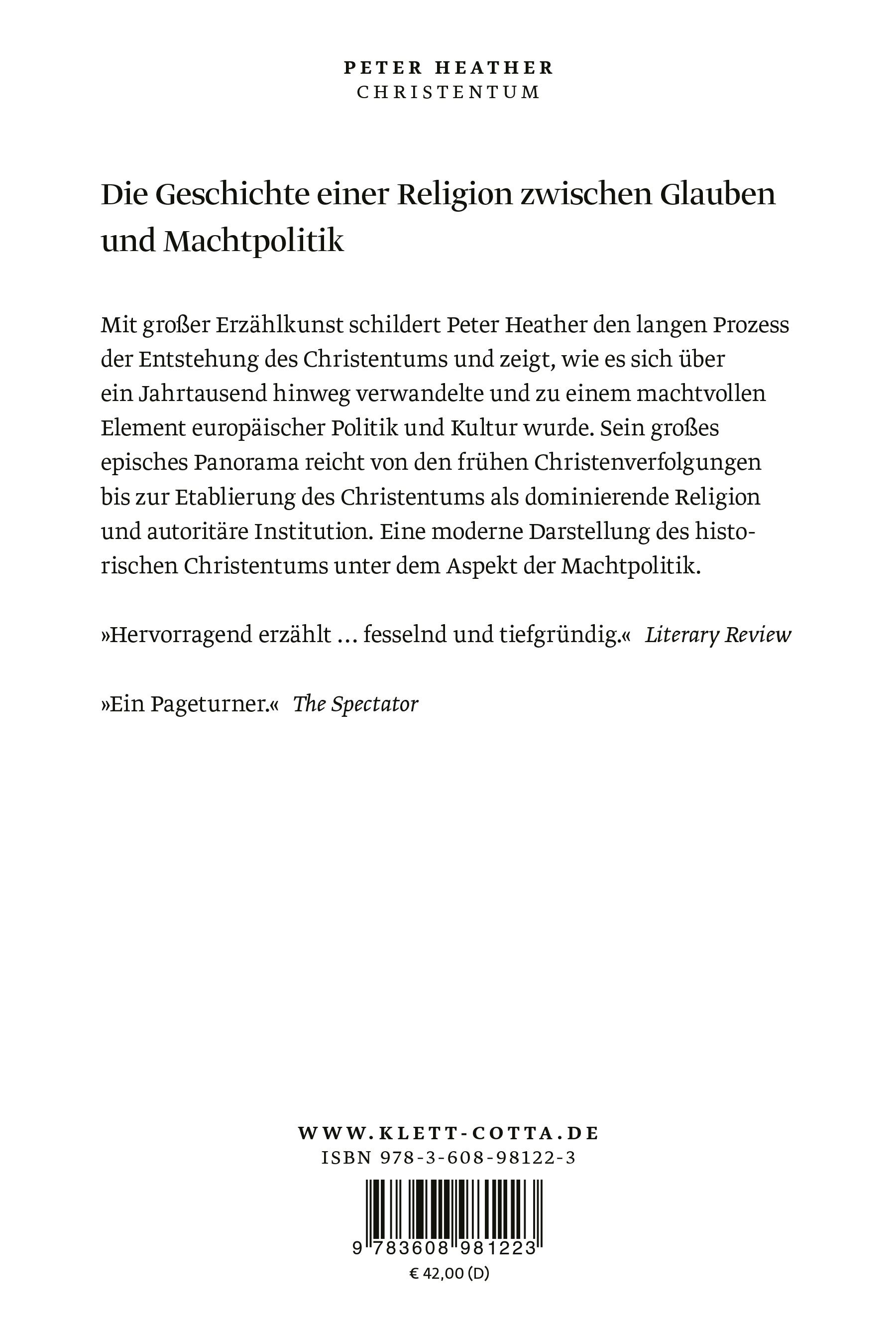 Mit großer Erzählkunst schildert Peter Heather den langen Prozess der Entstehung des Christentums und zeigt, wie es sich über ein Jahrtausend hinweg verwandelte und zu einem machtvollen Element europäischer Politik und Kultur wurde. Sein großes episches Panorama reicht von den frühen Christenverfolgungen bis zur Etablierung des Christentums als dominierende Religion und autoritäre Institution. Eine moderne Darstellung des historischen Christentums unter dem Aspekt der Machtpolitik für unsere Zeit.