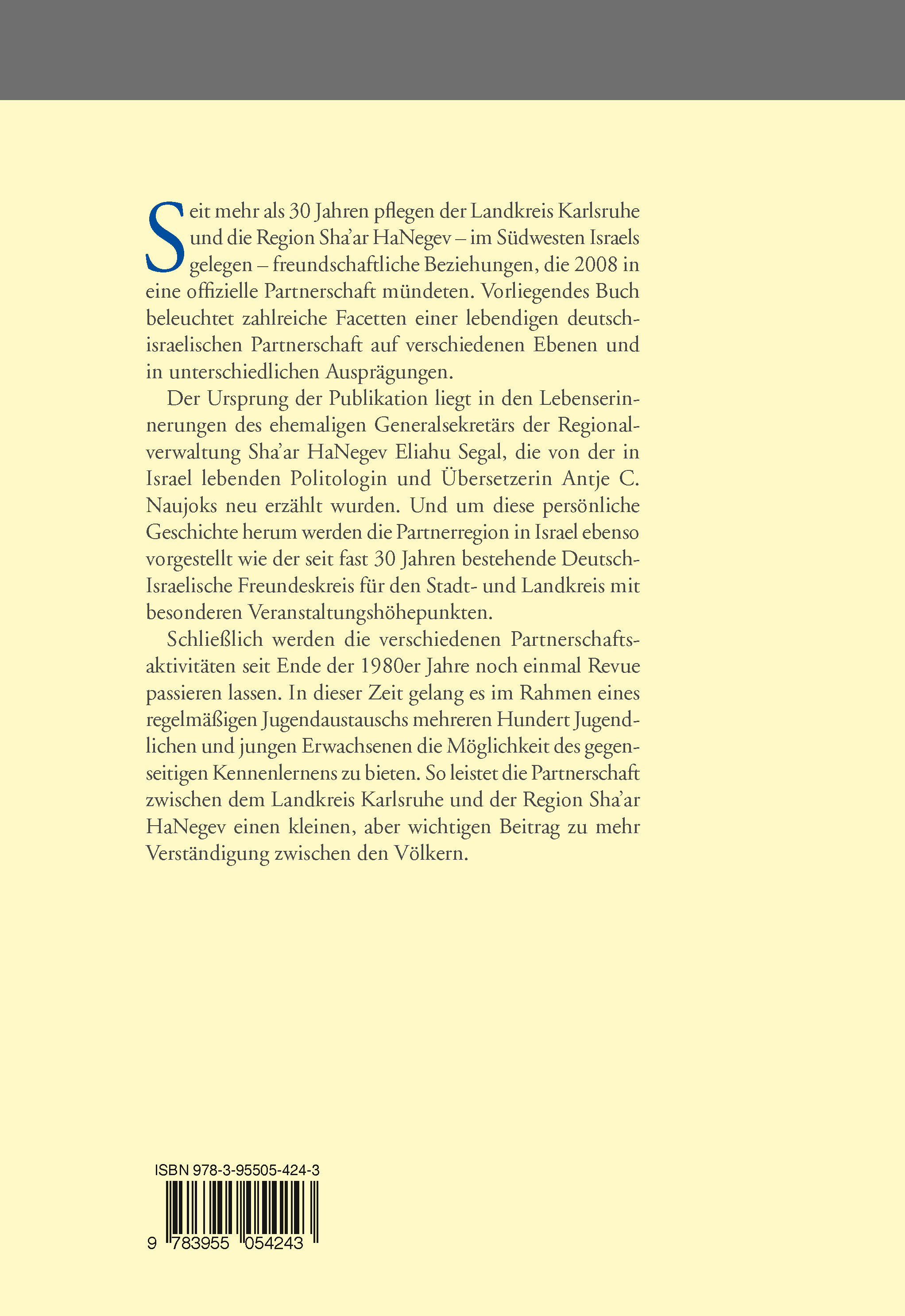 Seit mehr als 30 Jahren pflegen der Landkreis Karlsruhe und die Region Sha'ar HaNegev - im Südwesten Israels gelegen - freundschaftliche Beziehungen, die 2008 in eine offizielle Partnerschaft mündeten. Vorliegendes Buch beleuchtet zahlreiche Facetten einer lebendigen deutschisraelischen Partnerschaft auf verschiedenen Ebenen und in unterschiedlichen Ausprägungen. Der Ursprung der Publikation liegt in den Lebenserinnerungen des ehemaligen Generalsekretärs der Regionalverwaltung Sha'ar HaNegev Eliahu Segal, die von der in Israel lebenden Politologin und Übersetzerin Antje C. Naujoks neu erzählt wurden. Und um diese persönliche Geschichte herum werden die Partnerregion in Israel ebenso vorgestellt wie der seit fast 30 Jahren bestehende Deutsch-Israelische Freundeskreis für den Stadt- und Landkreis mit besonderen Veranstaltungshöhepunkten. Schließlich werden die verschiedenen Partnerschaftsaktivitäten seit Ende der 1980er Jahre noch einmal Revue passieren lassen. In dieser Zeit gelang es im Rahmen eines regelmäßigen Jugendaustauschs mehreren Hundert Jugendlichen und jungen Erwachsenen die Möglichkeit des gegenseitigen Kennenlernens zu bieten. So leistet die Partnerschaft zwischen dem Landkreis Karlsruhe und der Region Sha'ar HaNegev einen kleinen, aber wichtigen Beitrag zu mehr Verständigung zwischen den Völkern.