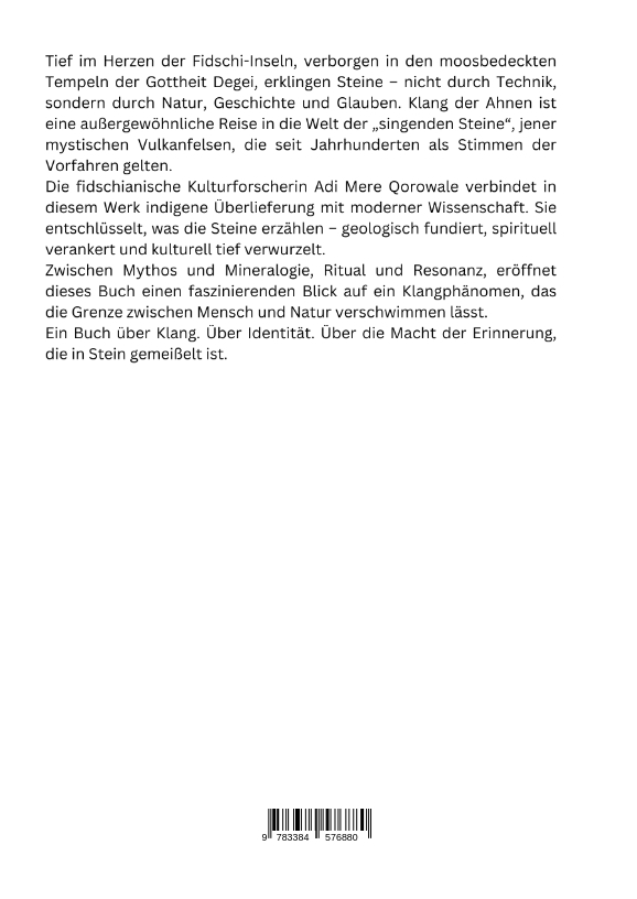Tief im Herzen der Fidschi-Inseln, verborgen in den moosbedeckten Tempeln der Gottheit Degei, erklingen Steine - nicht durch Technik, sondern durch Natur, Geschichte und Glauben. Klang der Ahnen ist eine außergewöhnliche Reise in die Welt der "singenden Steine", jener mystischen Vulkanfelsen, die seit Jahrhunderten als Stimmen der Vorfahren gelten.Die fidschianische Kulturforscherin Adi Mere Qorowale verbindet in diesem Werk indigene Überlieferung mit moderner Wissenschaft. Sie entschlüsselt, was die Steine erzählen - geologisch fundiert, spirituell verankert und kulturell tief verwurzelt.Zwischen Mythos und Mineralogie, Ritual und Resonanz, eröffnet dieses Buch einen faszinierenden Blick auf ein Klangphänomen, das die Grenze zwischen Mensch und Natur verschwimmen lässt.Ein Buch über Klang. Über Identität. Über die Macht der Erinnerung, die in Stein gemeißelt ist.