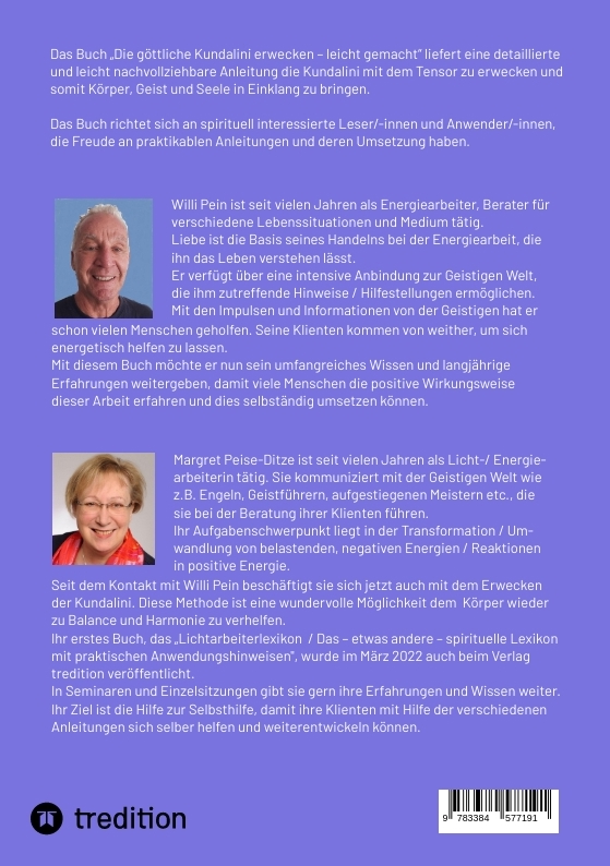 Über viele Jahre der spirituellen Suche und umfangreichen Fortbildungen hat Margret Peise-Ditze sich in der Lichtarbeit entwickelt und schließlich ihren Schwerpunkt in der Transformationsarbeit gefunden – der Umwandlung von belastender, negativer Energie in positive Energie. Im Rahmen dieser Fortbildungen wurde sie ständig mit Begriffen konfrontiert, die ihr zwar geläufig waren – aber nicht genau. Die Suche nach Definitionen und Zusammenhängen war sehr zeitaufwendig. Daraus entstand die Idee, dieses Lichtarbeiter-Lexikon zu erstellen, das neben den Begriffen, detaillierten Erklärungen auch Anwendungshinweise beinhaltet. In ihrem Beruf als Verwaltungs-/Personalleiterin hat Margret Peise-Ditze umfassende Erfahrungen mit den verschiedensten Menschen sammeln können. Dabei hat ihr das Wissen und die Fähigkeiten als Licht-/Energiearbeiterin sehr geholfen. Seit dem Kontakt mit Willi Pein und der gemeinsamen Arbeit an dem ersten Buch "Die göttliche Energie der Kundalini erwecken - leicht gemacht" und dem zweiten Buch "Die perfekte Handhabung des Tensors" / Fragen - Antworten - Deutung / eine vertiefende und praxisorientierte Anleitung", beschäftigt sie sich jetzt auch mit der Tensorarbeit. Nach ihrem gemeinsamen 3. Buch „Energetische Reinigung – Transformation – Manifestation“ ist jetzt das 4. Buch zum Thema „Energetische Heilkraft“ erschienen. In diesem Buch wird nachvollziehbar beschrieben, wie eine Grundlage / Basis geschaffen wird, damit die energetische Heilkraft wirken kann sowie eine Beschreibung der physischen, energetischen und seelischen Symptome und Listung der möglichen Handlungen / Lösungen dafür. Ihr Ziel ist die Hilfe zur Selbsthilfe – sie berät, gibt Impulse bei der spirituellen Entwicklung, stellt Anleitungen zur Verfügung und gibt ihre Erfahrungen in Einzel- und Gruppensitzungen weiter.