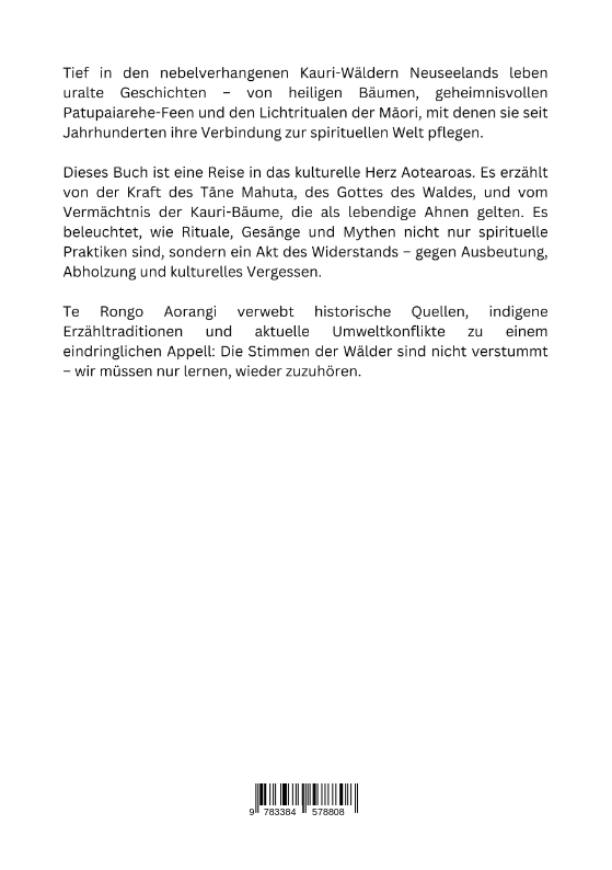 Tief in den nebelverhangenen Kauri-Wäldern Neuseelands leben uralte Geschichten - von heiligen Bäumen, geheimnisvollen Patupaiarehe-Feen und den Lichtritualen der Maori, mit denen sie seit Jahrhunderten ihre Verbindung zur spirituellen Welt pflegen.Dieses Buch ist eine Reise in das kulturelle Herz Aotearoas. Es erzählt von der Kraft des Tane Mahuta, des Gottes des Waldes, und vom Vermächtnis der Kauri-Bäume, die als lebendige Ahnen gelten. Es beleuchtet, wie Rituale, Gesänge und Mythen nicht nur spirituelle Praktiken sind, sondern ein Akt des Widerstands - gegen Ausbeutung, Abholzung und kulturelles Vergessen.Te Rongo Aorangi verwebt historische Quellen, indigene Erzähltraditionen und aktuelle Umweltkonflikte zu einem eindringlichen Appell: Die Stimmen der Wälder sind nicht verstummt - wir müssen nur lernen, wieder zuzuhören.